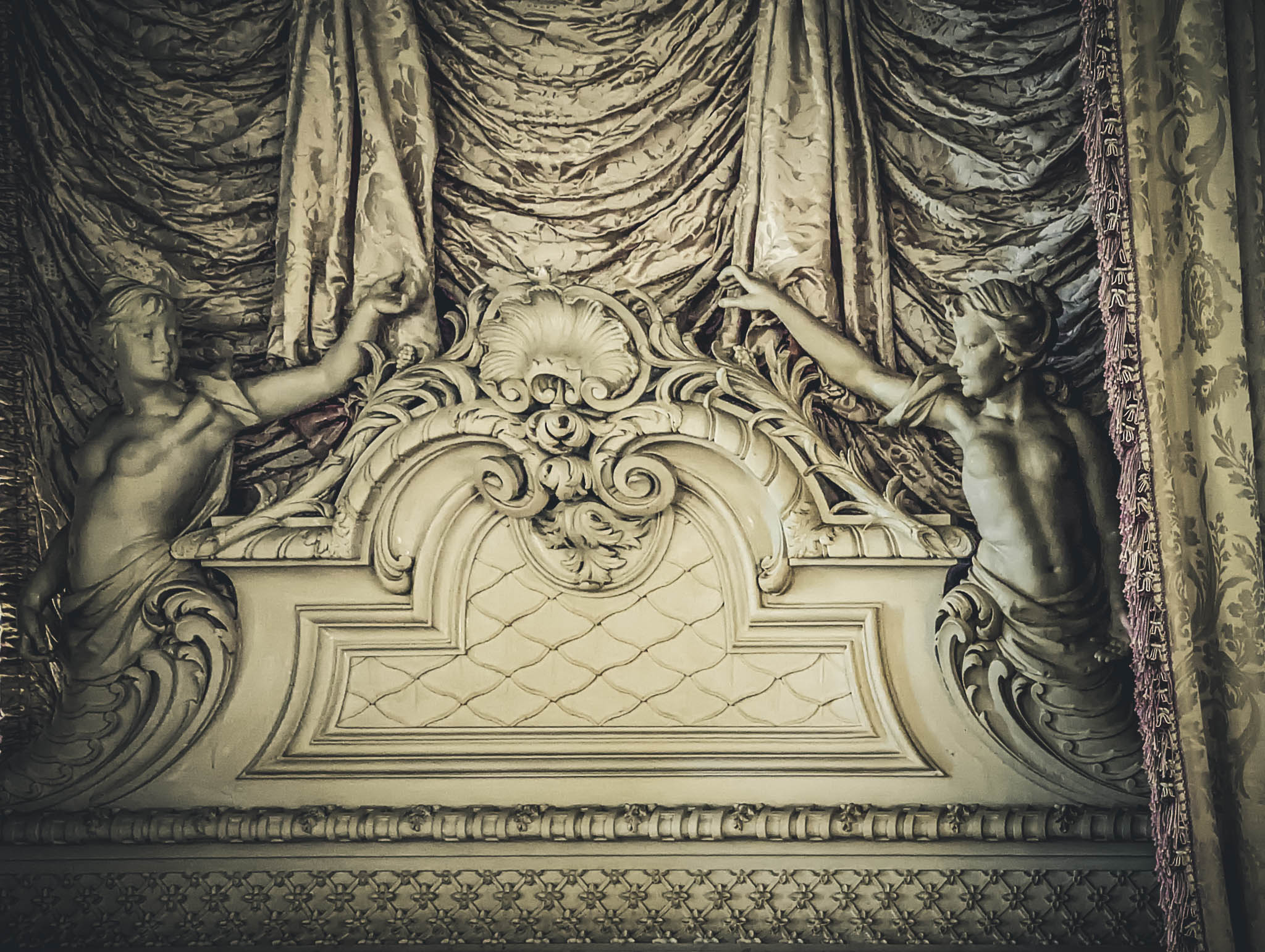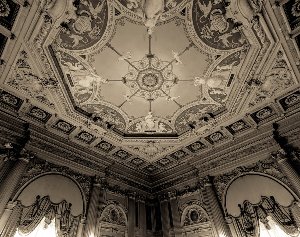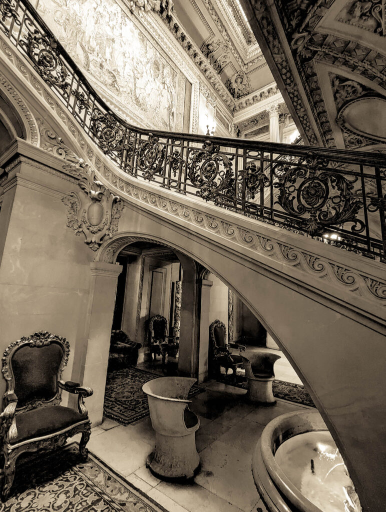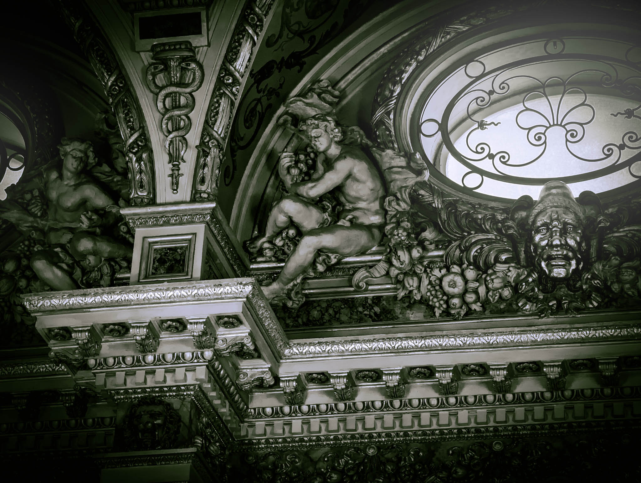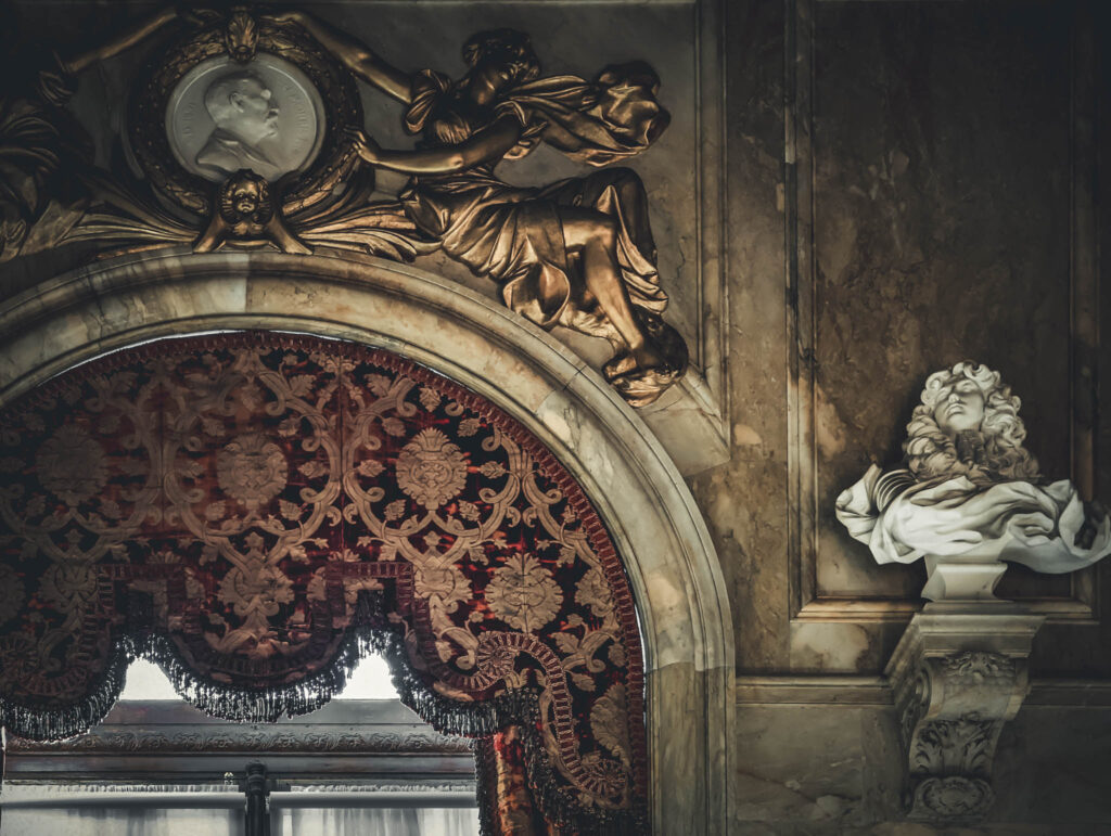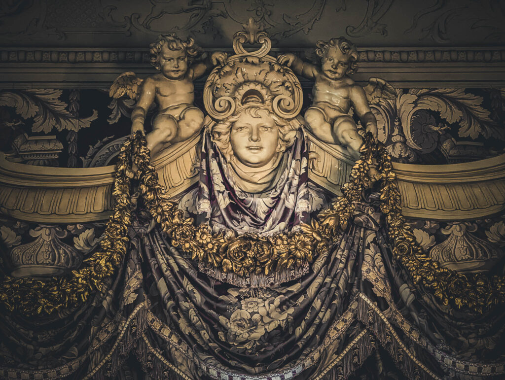 At least Commodore Vanderbilt’s grandkids left the houses for (ultimately) others to admire. Also, my high-hat reflexes aside: there is a quirky melancholy, or even a hint of damnation, in all these gloriously-proportioned and gilded chambers. Faces painted, cast, or carved — many of them smiling but others grim or despairingly lost — are everywhere, leaning out from frames or urns or light-fixtures. And the mirrors! In the reflections it seems my camera caught a more desolate version of reality, cracks in the plaster, rich tints fading to powdery-pastels, spaces as empty and lonely as a foreclosed ruin. This odd sepulchral tinge — was it always there? Does it just “come” with the over-the-top Beaux-Arts? Or did it accumulate over the brief century of Vanderbilt decline since?