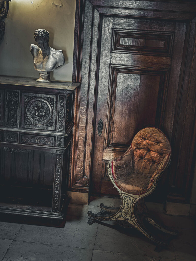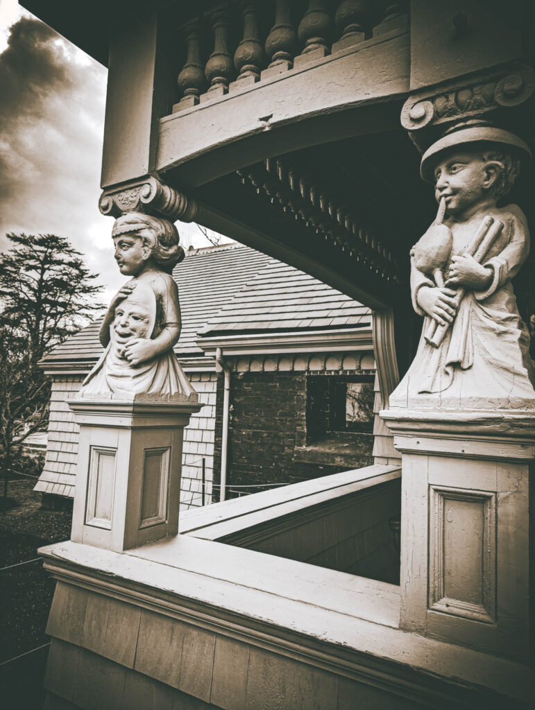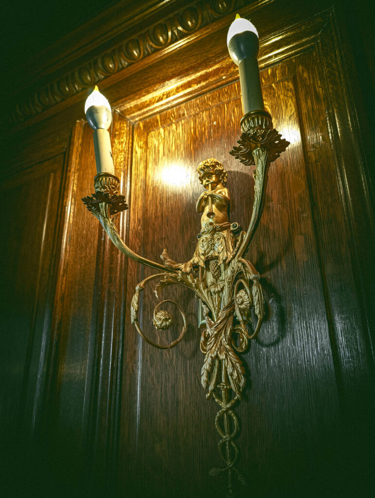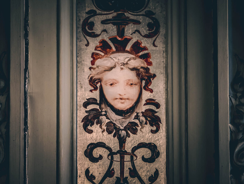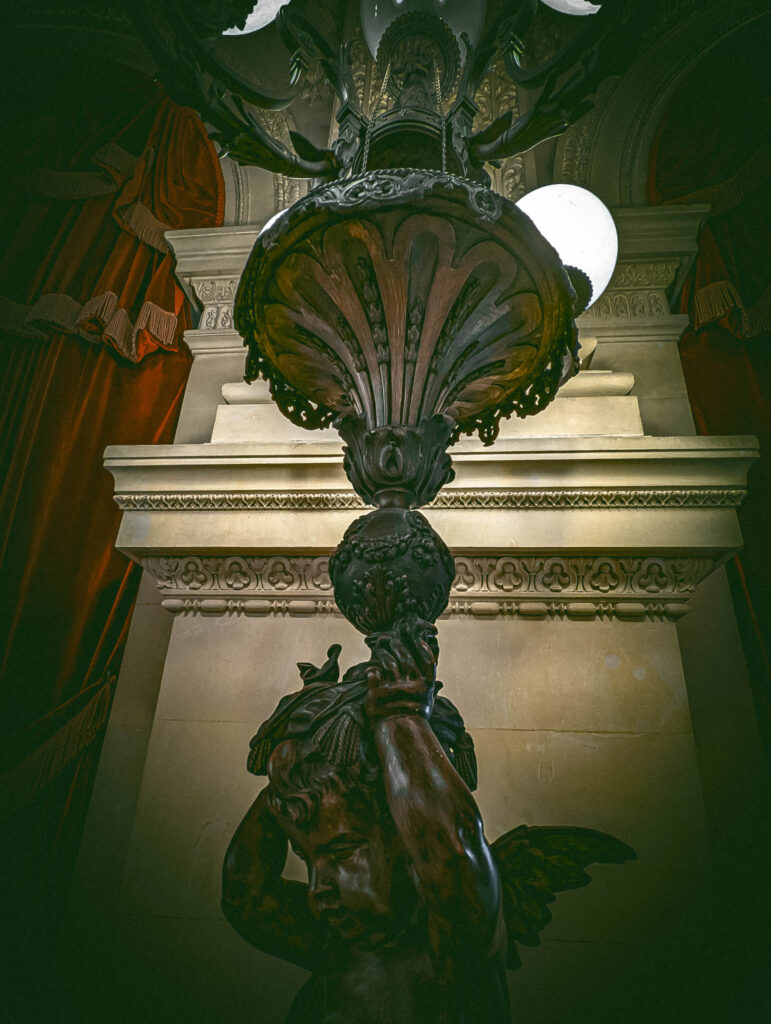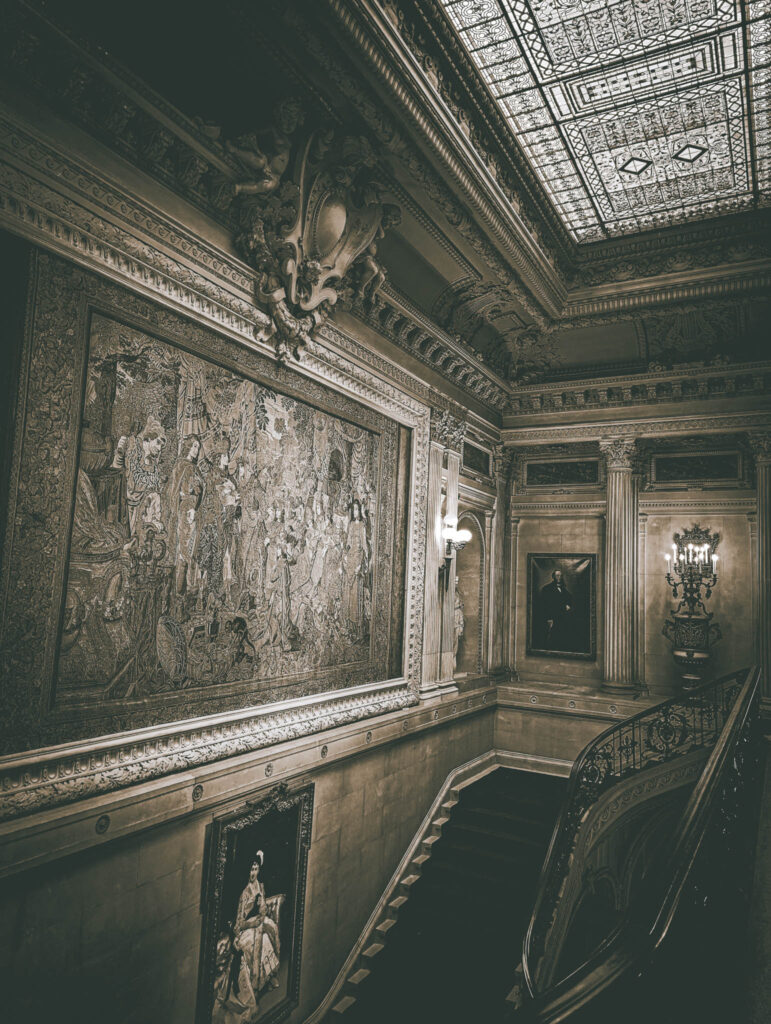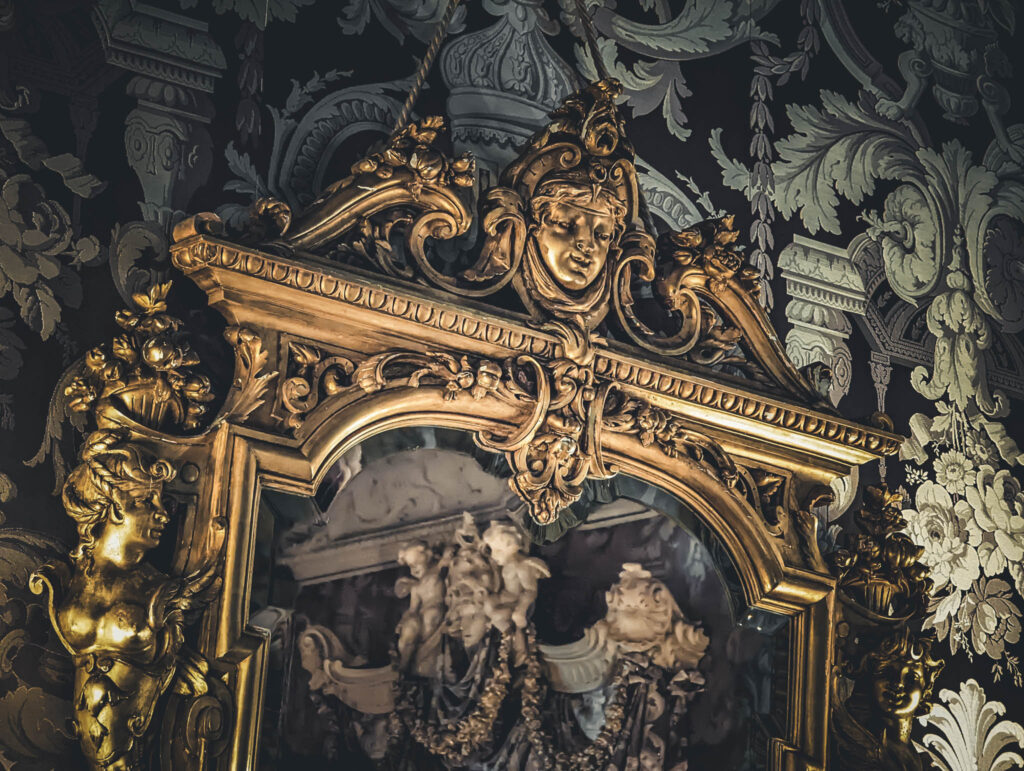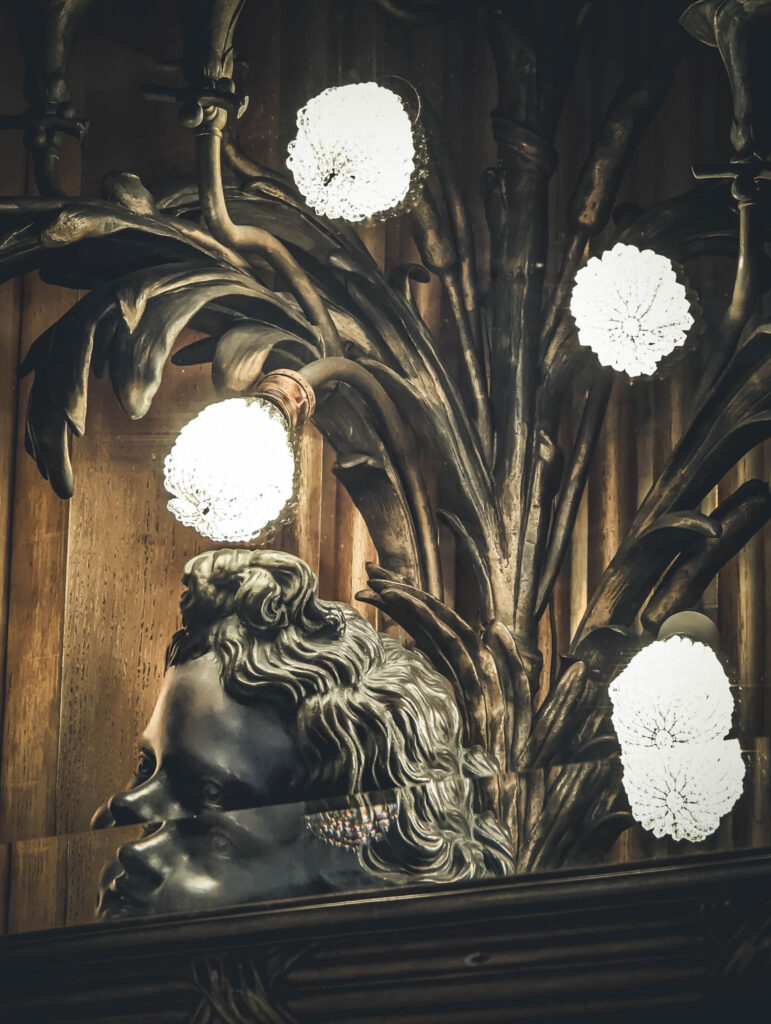At least Commodore Vanderbilt’s grandkids left the houses for (ultimately) others to admire. Also, my high-hat reflexes aside: there is a quirky melancholy, or even a hint of damnation, in all these gloriously-proportioned and gilded chambers. Faces painted, cast, or carved — many of them smiling but others grim or despairingly lost — are everywhere, leaning out from frames or urns or light-fixtures. And the mirrors! In the reflections it seems my camera caught a more desolate version of reality, cracks in the plaster, rich tints fading to powdery-pastels, spaces as empty and lonely as a foreclosed ruin. This odd sepulchral tinge — was it always there? Does it just “come” with the over-the-top Beaux-Arts? Or did it accumulate over the brief century of Vanderbilt decline since?