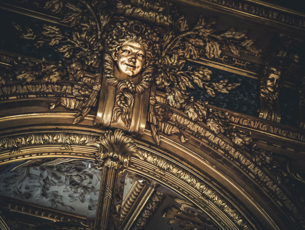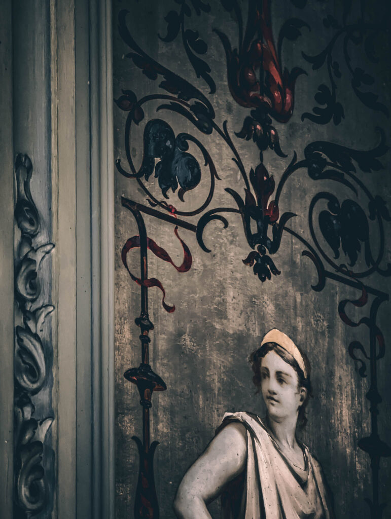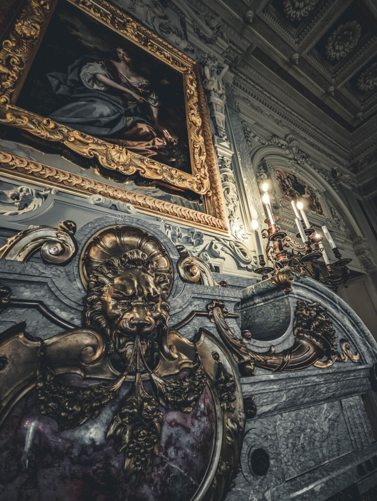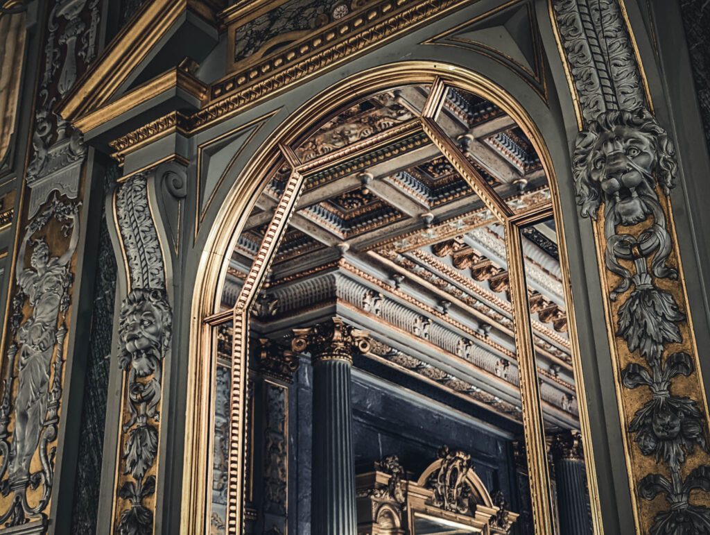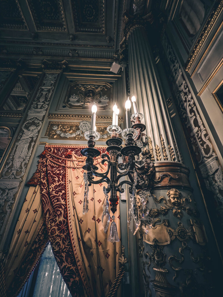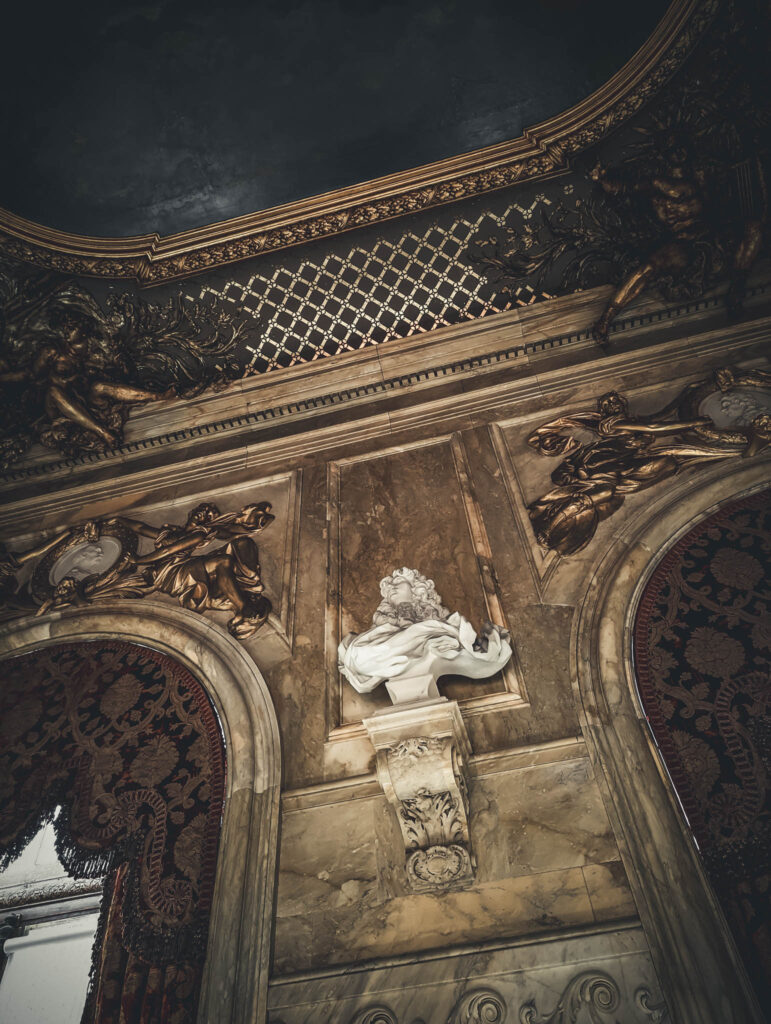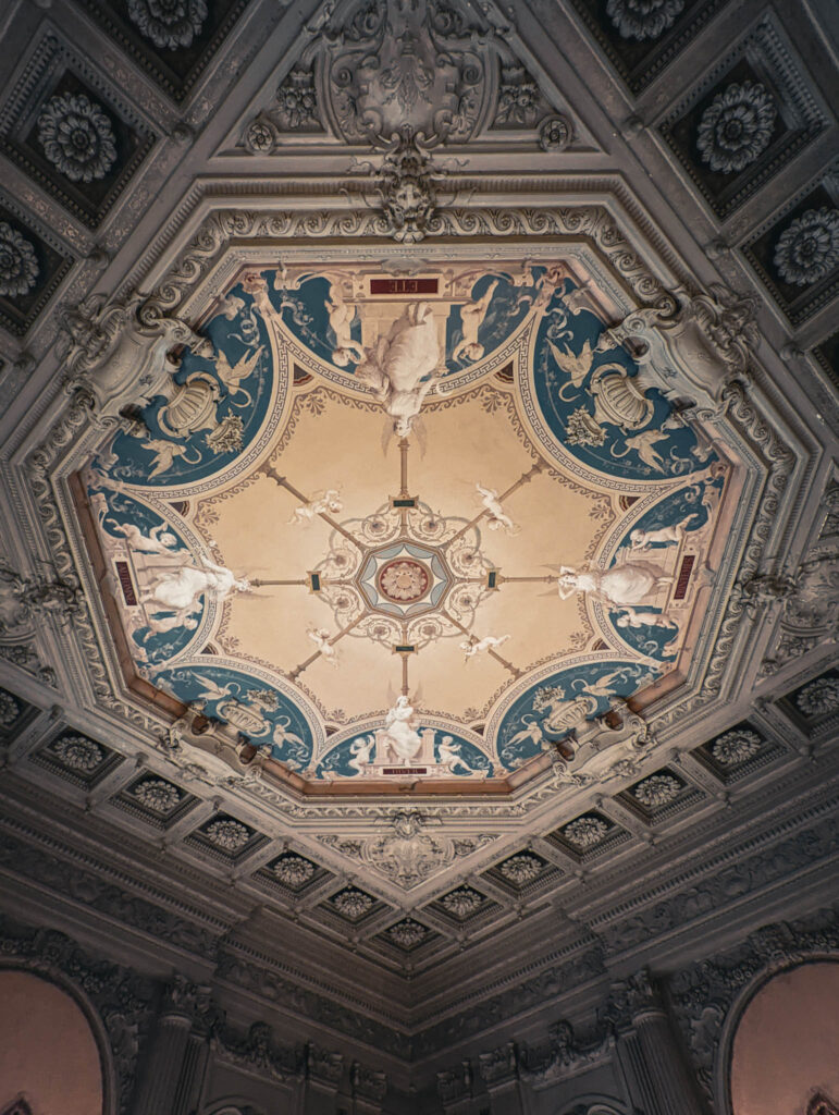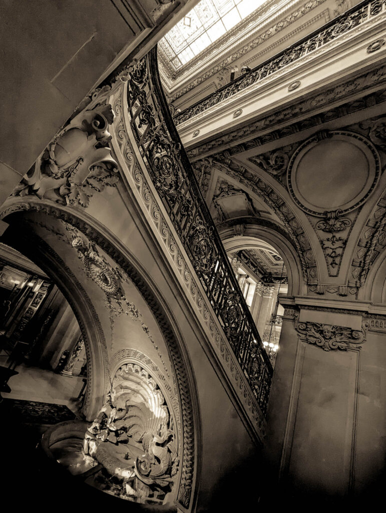 At least Commodore Vanderbilt’s grandkids left the houses for (ultimately) others to admire. Also, my high-hat reflexes aside: there is a quirky melancholy, or even a hint of damnation, in all these gloriously-proportioned and gilded chambers. Faces painted, cast, or carved — many of them smiling but others grim or despairingly lost — are everywhere, leaning out from frames or urns or light-fixtures. And the mirrors! In the reflections it seems my camera caught a more desolate version of reality, cracks in the plaster, rich tints fading to powdery-pastels, spaces as empty and lonely as a foreclosed ruin. This odd sepulchral tinge — was it always there? Does it just “come” with the over-the-top Beaux-Arts? Or did it accumulate over the brief century of Vanderbilt decline since?