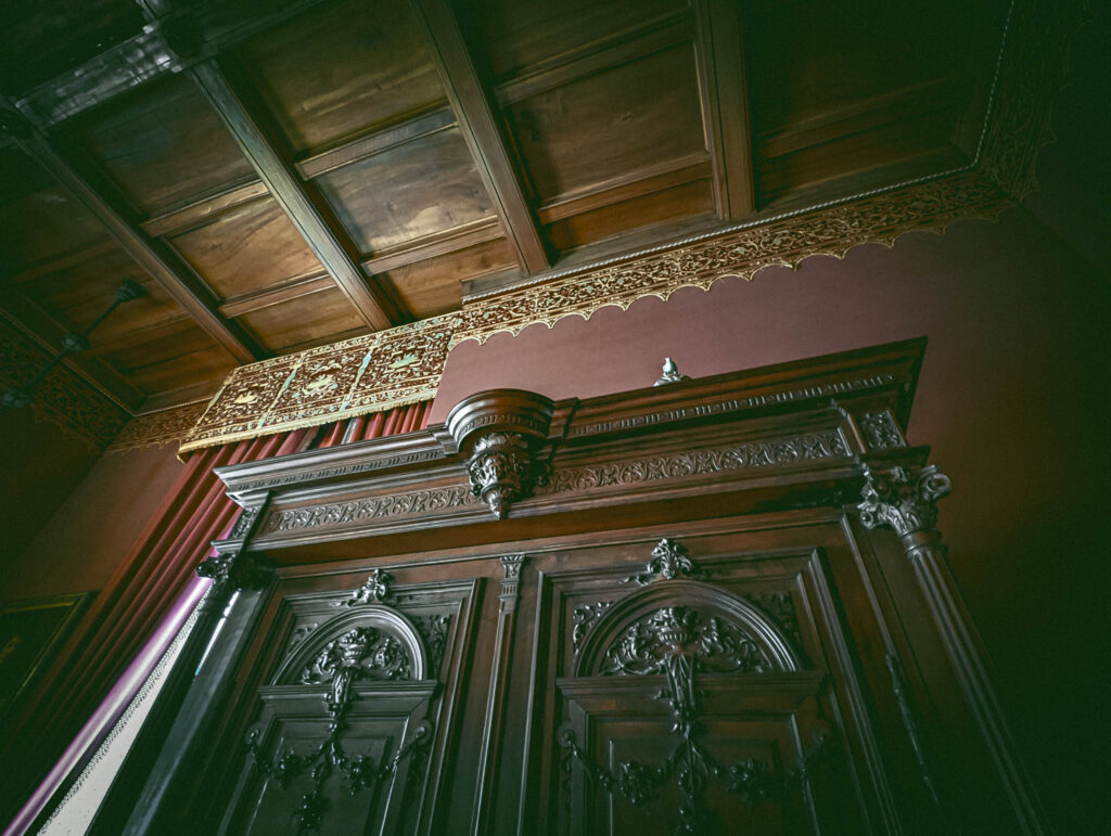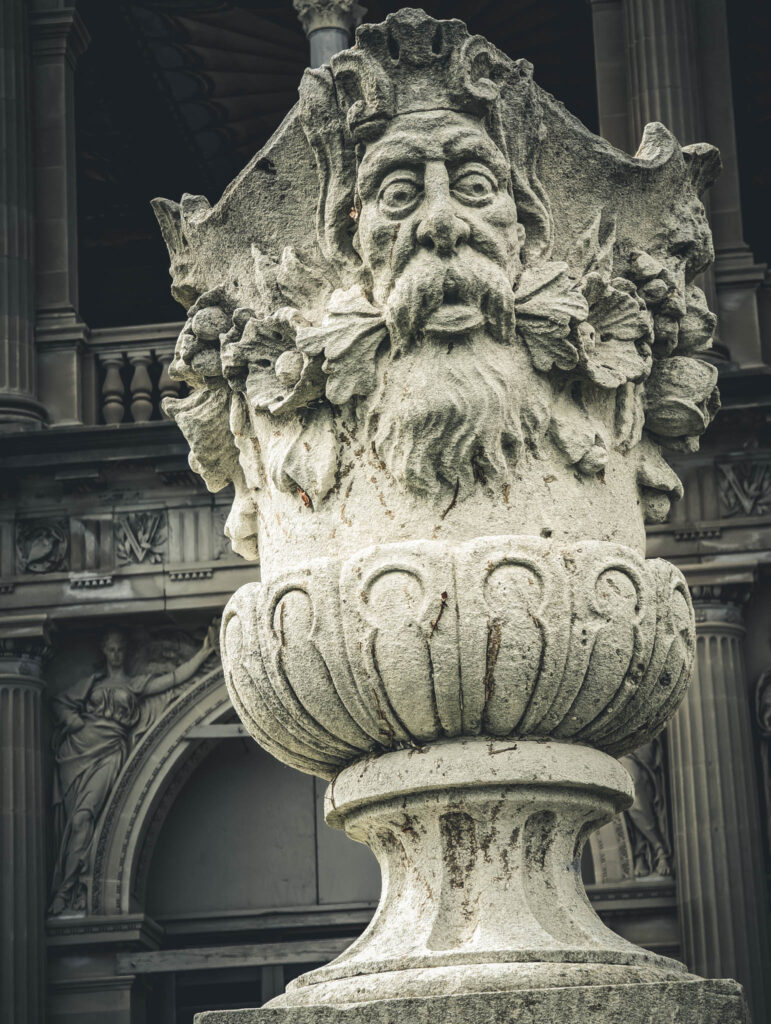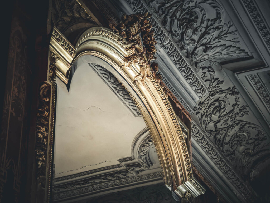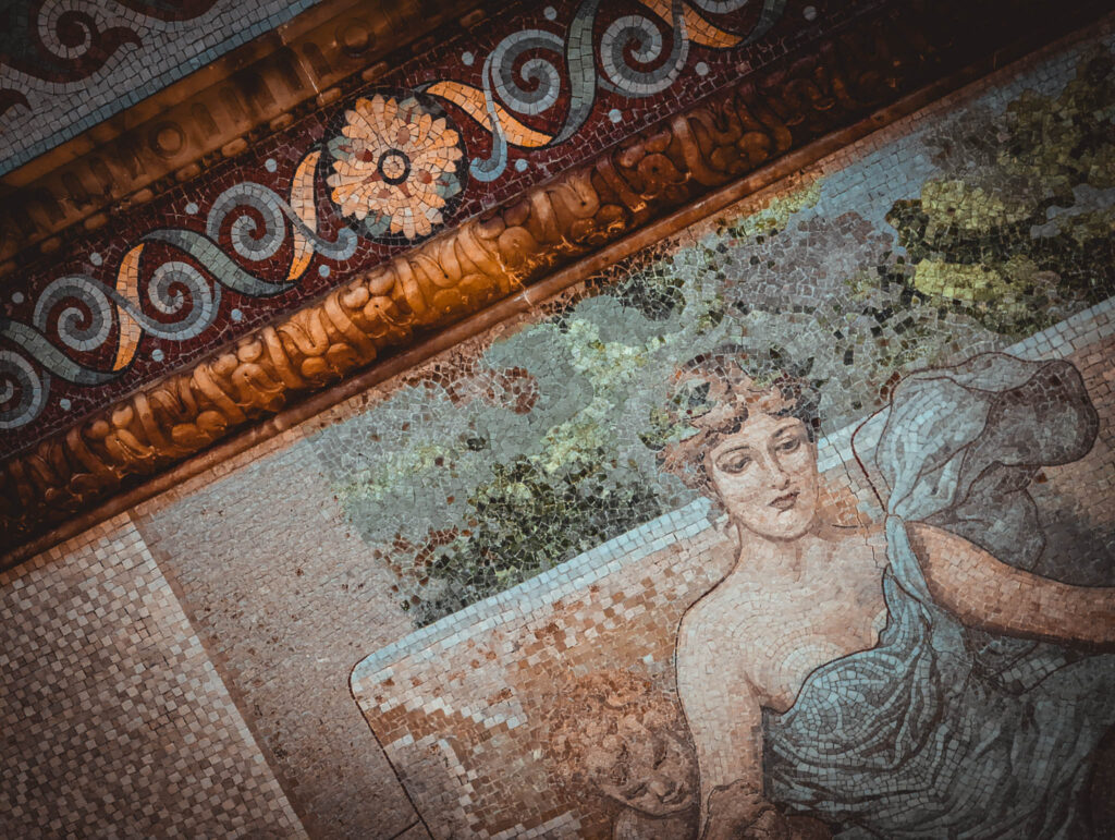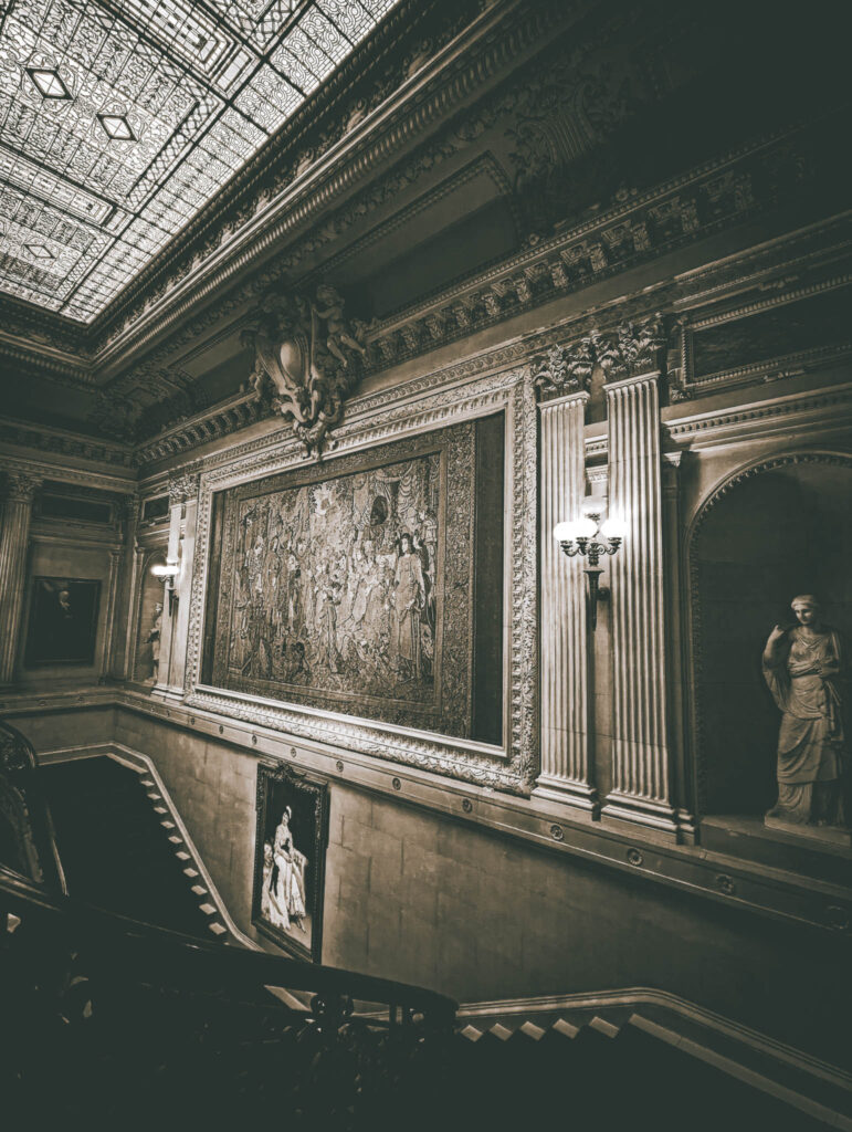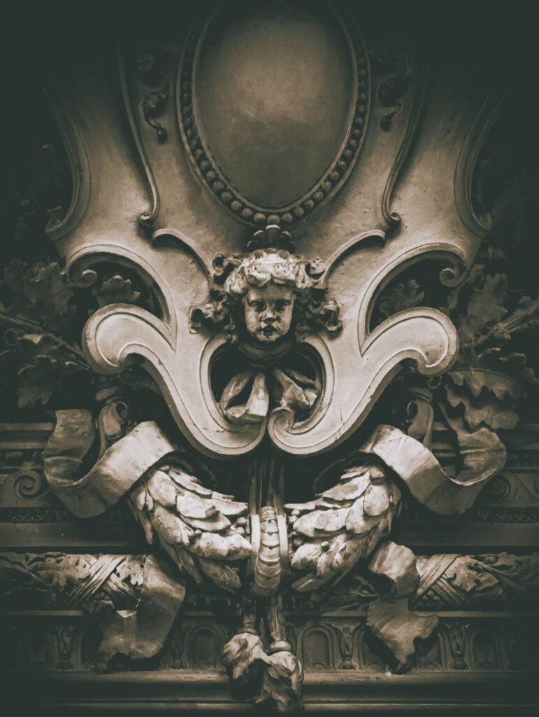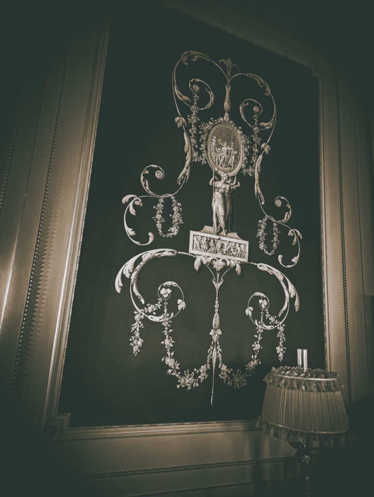 At least Commodore Vanderbilt’s grandkids left the houses for (ultimately) others to admire. Also, my high-hat reflexes aside: there is a quirky melancholy, or even a hint of damnation, in all these gloriously-proportioned and gilded chambers. Faces painted, cast, or carved — many of them smiling but others grim or despairingly lost — are everywhere, leaning out from frames or urns or light-fixtures. And the mirrors! In the reflections it seems my camera caught a more desolate version of reality, cracks in the plaster, rich tints fading to powdery-pastels, spaces as empty and lonely as a foreclosed ruin. This odd sepulchral tinge — was it always there? Does it just “come” with the over-the-top Beaux-Arts? Or did it accumulate over the brief century of Vanderbilt decline since?