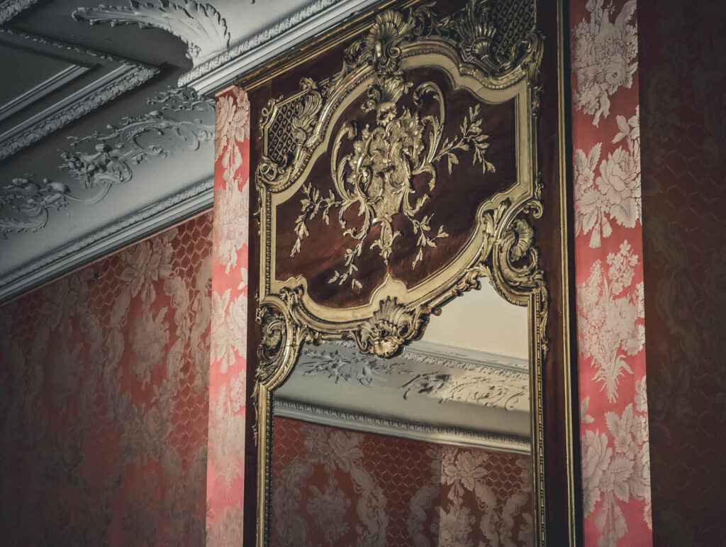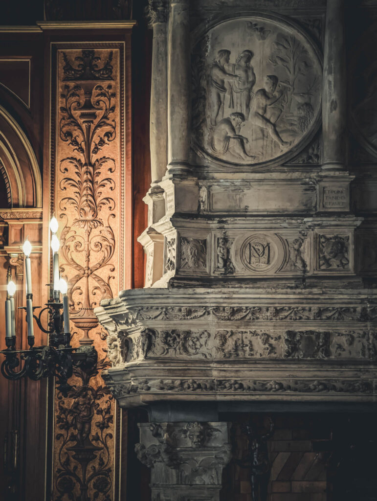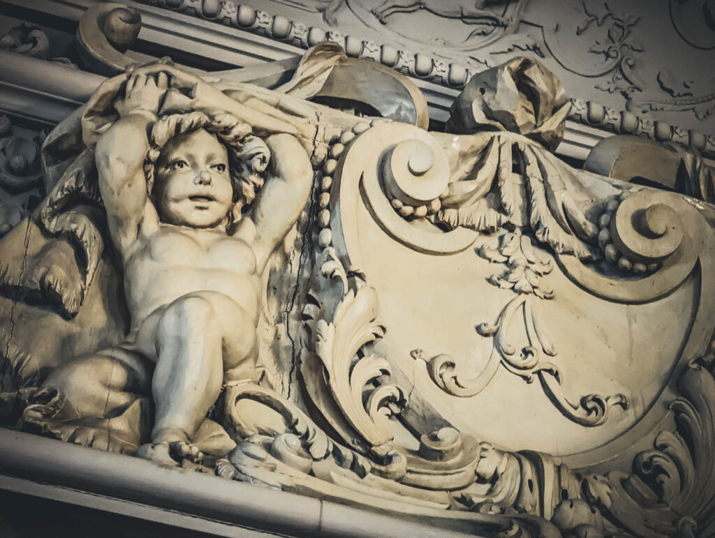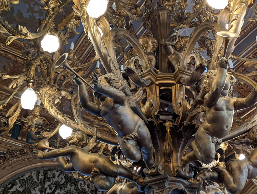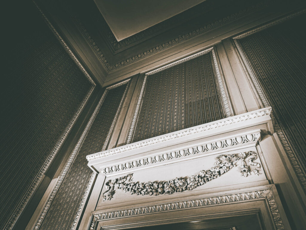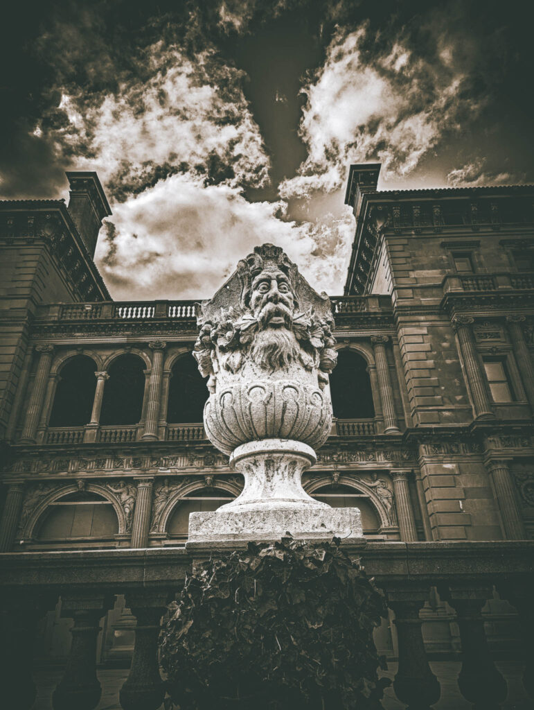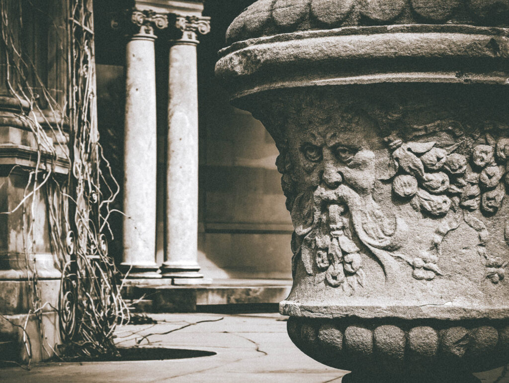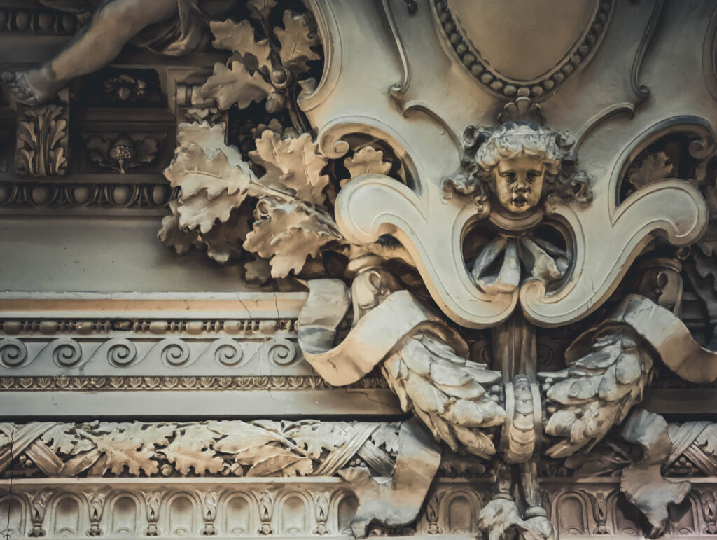 At least Commodore Vanderbilt’s grandkids left the houses for (ultimately) others to admire. Also, my high-hat reflexes aside: there is a quirky melancholy, or even a hint of damnation, in all these gloriously-proportioned and gilded chambers. Faces painted, cast, or carved — many of them smiling but others grim or despairingly lost — are everywhere, leaning out from frames or urns or light-fixtures. And the mirrors! In the reflections it seems my camera caught a more desolate version of reality, cracks in the plaster, rich tints fading to powdery-pastels, spaces as empty and lonely as a foreclosed ruin. This odd sepulchral tinge — was it always there? Does it just “come” with the over-the-top Beaux-Arts? Or did it accumulate over the brief century of Vanderbilt decline since?