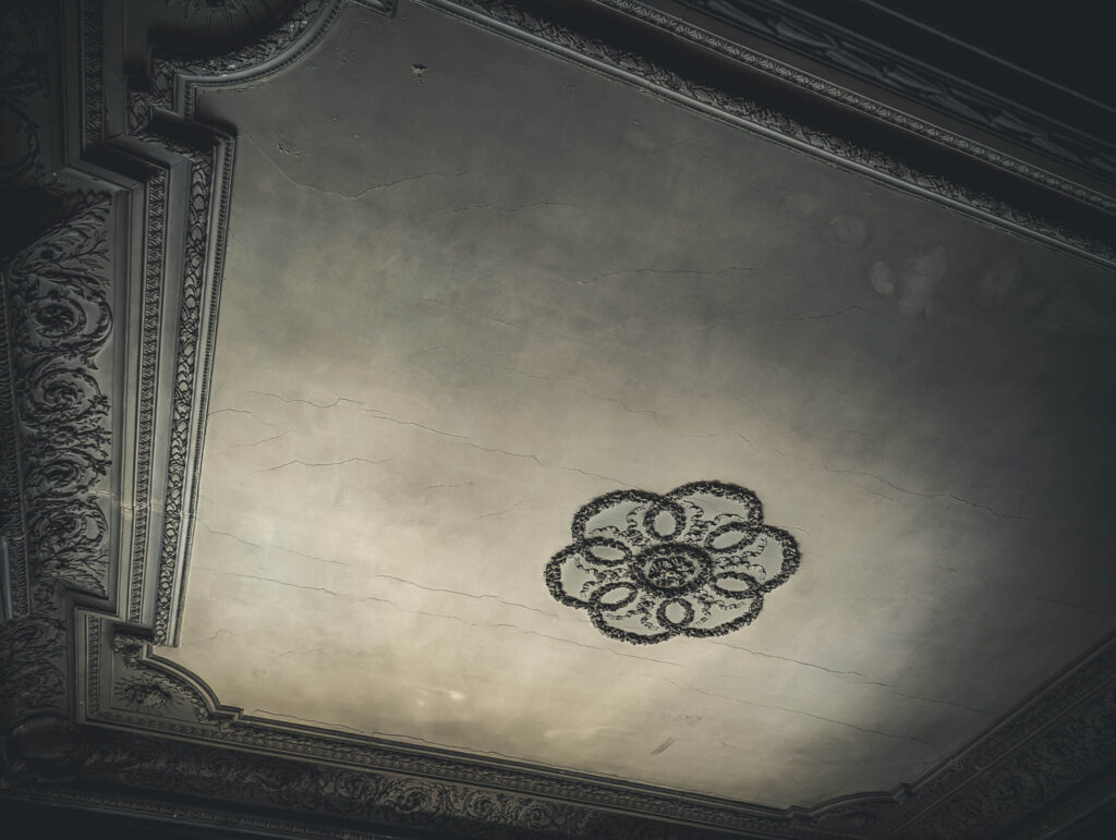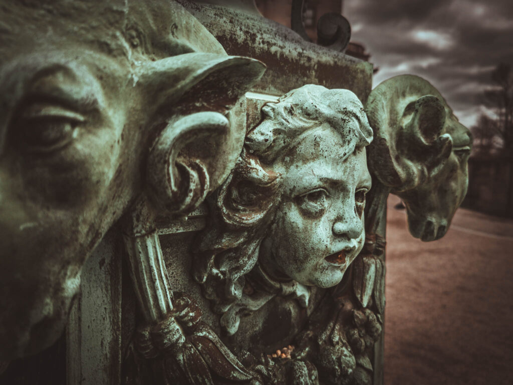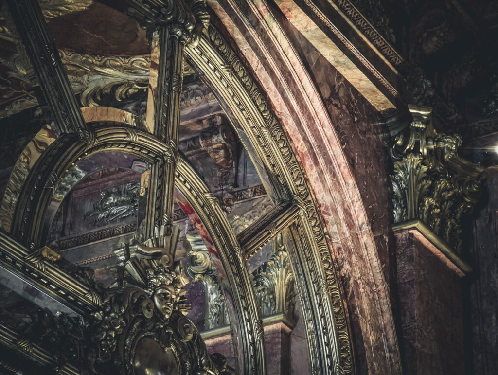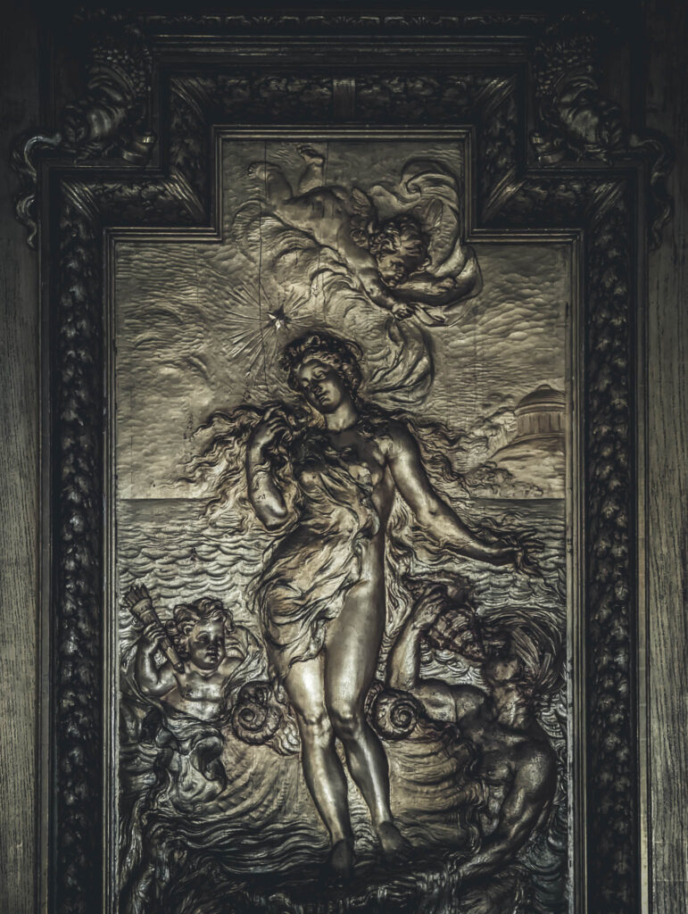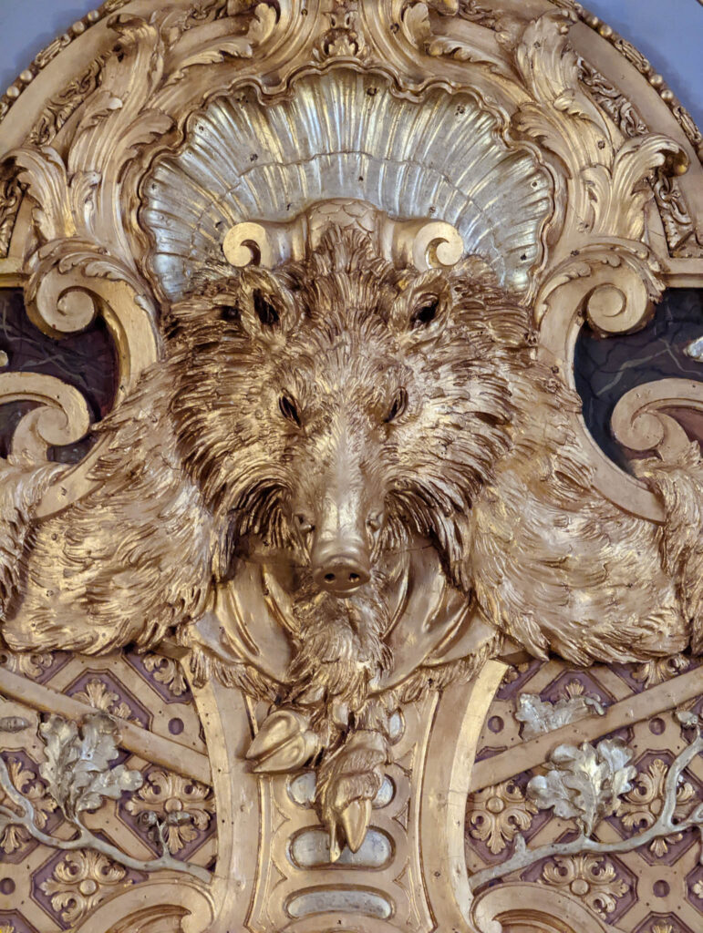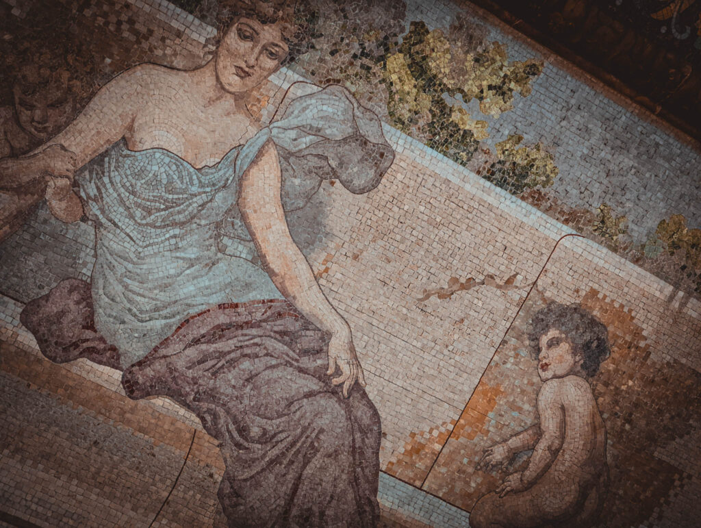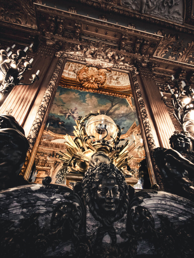 At least Commodore Vanderbilt’s grandkids left the houses for (ultimately) others to admire. Also, my high-hat reflexes aside: there is a quirky melancholy, or even a hint of damnation, in all these gloriously-proportioned and gilded chambers. Faces painted, cast, or carved — many of them smiling but others grim or despairingly lost — are everywhere, leaning out from frames or urns or light-fixtures. And the mirrors! In the reflections it seems my camera caught a more desolate version of reality, cracks in the plaster, rich tints fading to powdery-pastels, spaces as empty and lonely as a foreclosed ruin. This odd sepulchral tinge — was it always there? Does it just “come” with the over-the-top Beaux-Arts? Or did it accumulate over the brief century of Vanderbilt decline since?