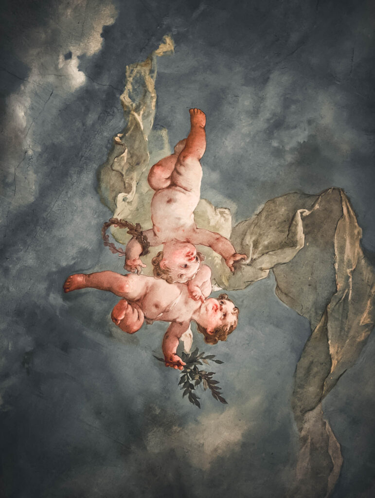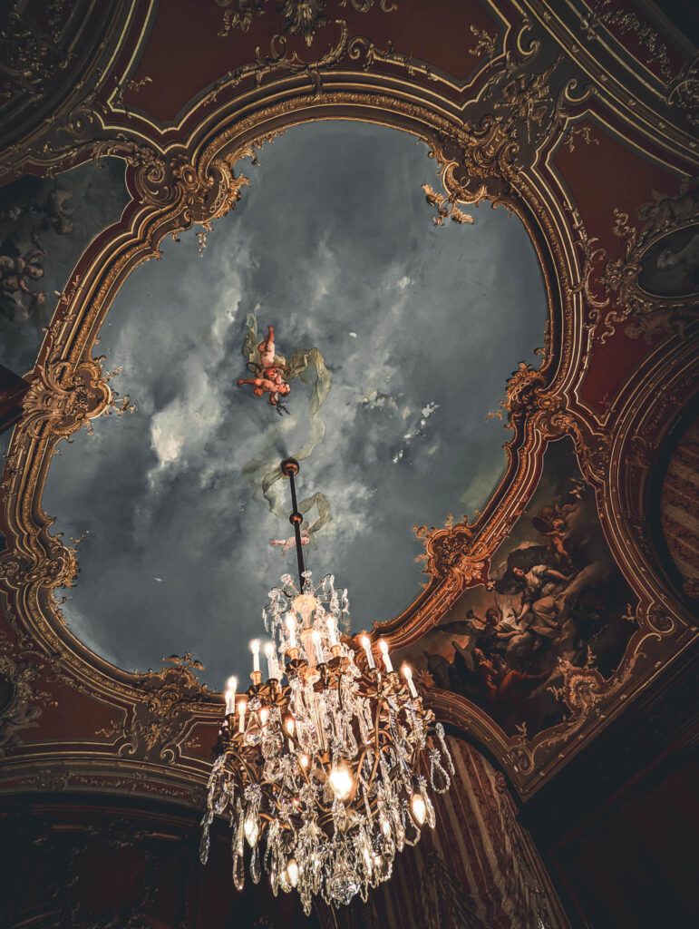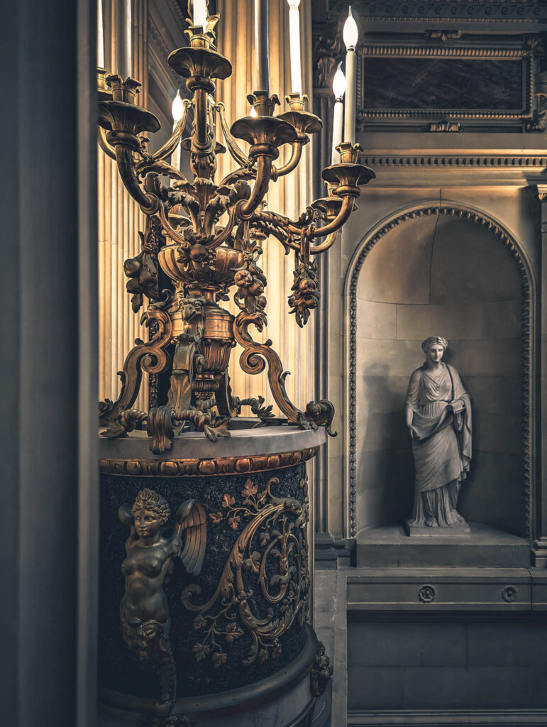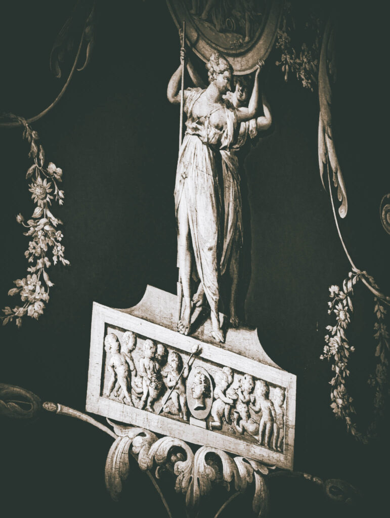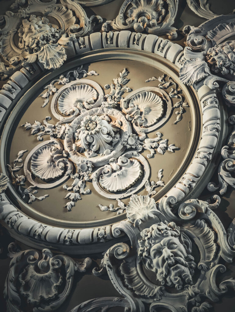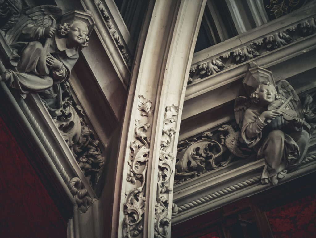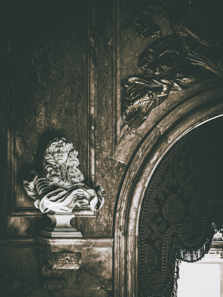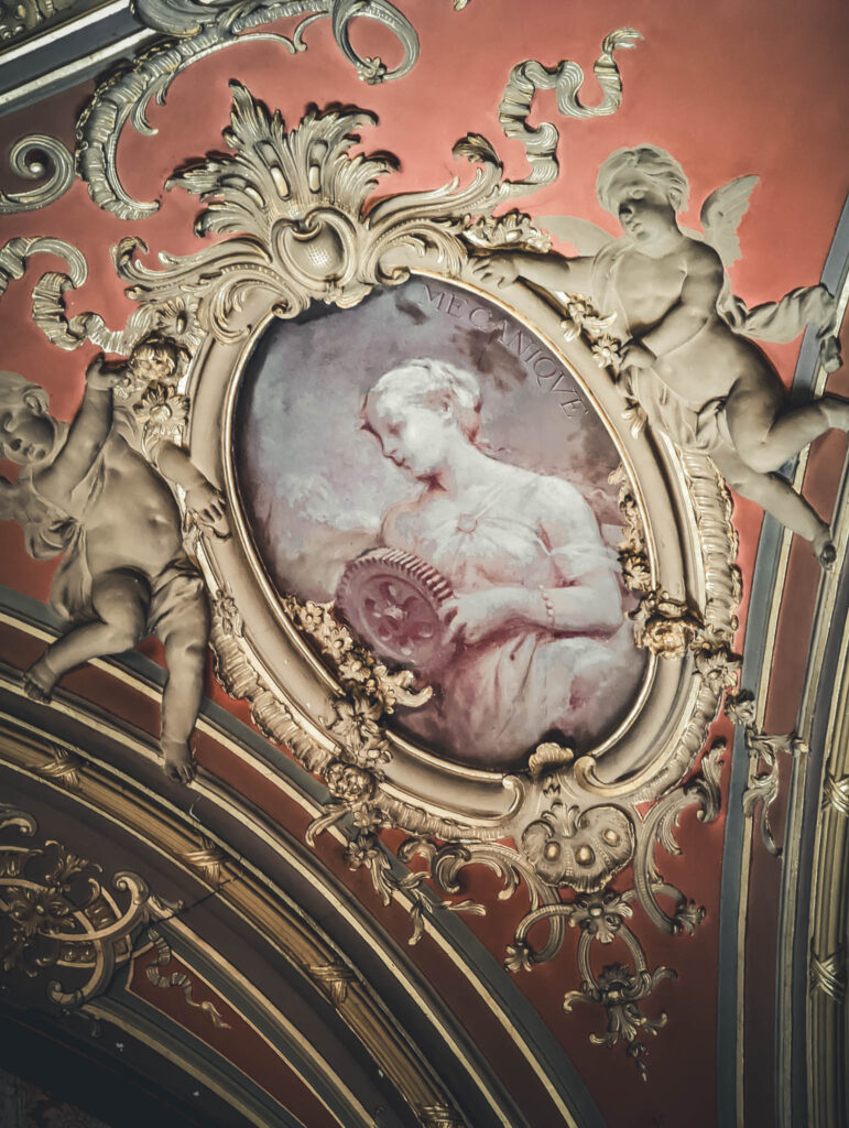 At least Commodore Vanderbilt’s grandkids left the houses for (ultimately) others to admire. Also, my high-hat reflexes aside: there is a quirky melancholy, or even a hint of damnation, in all these gloriously-proportioned and gilded chambers. Faces painted, cast, or carved — many of them smiling but others grim or despairingly lost — are everywhere, leaning out from frames or urns or light-fixtures. And the mirrors! In the reflections it seems my camera caught a more desolate version of reality, cracks in the plaster, rich tints fading to powdery-pastels, spaces as empty and lonely as a foreclosed ruin. This odd sepulchral tinge — was it always there? Does it just “come” with the over-the-top Beaux-Arts? Or did it accumulate over the brief century of Vanderbilt decline since?