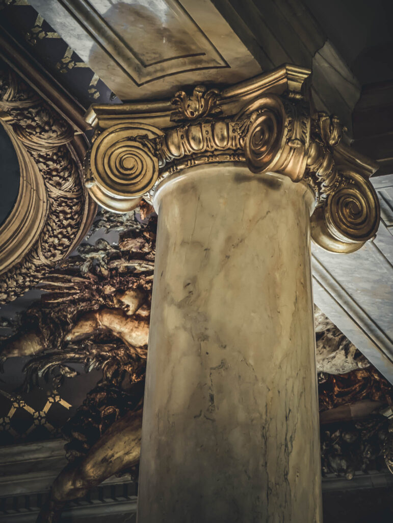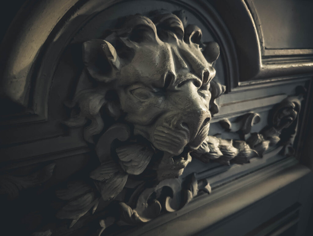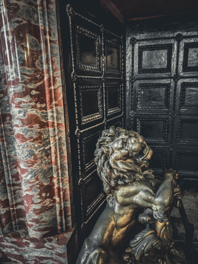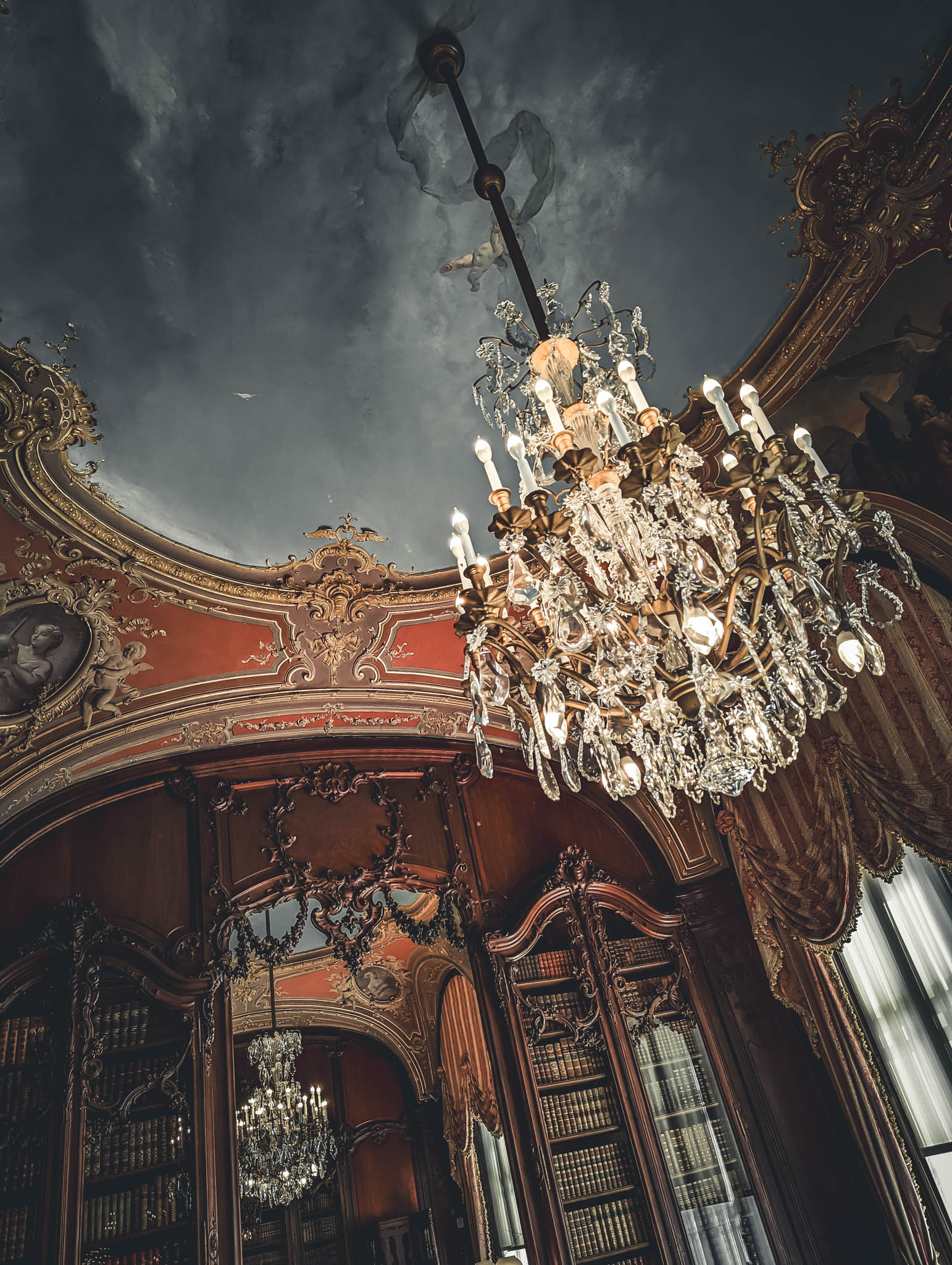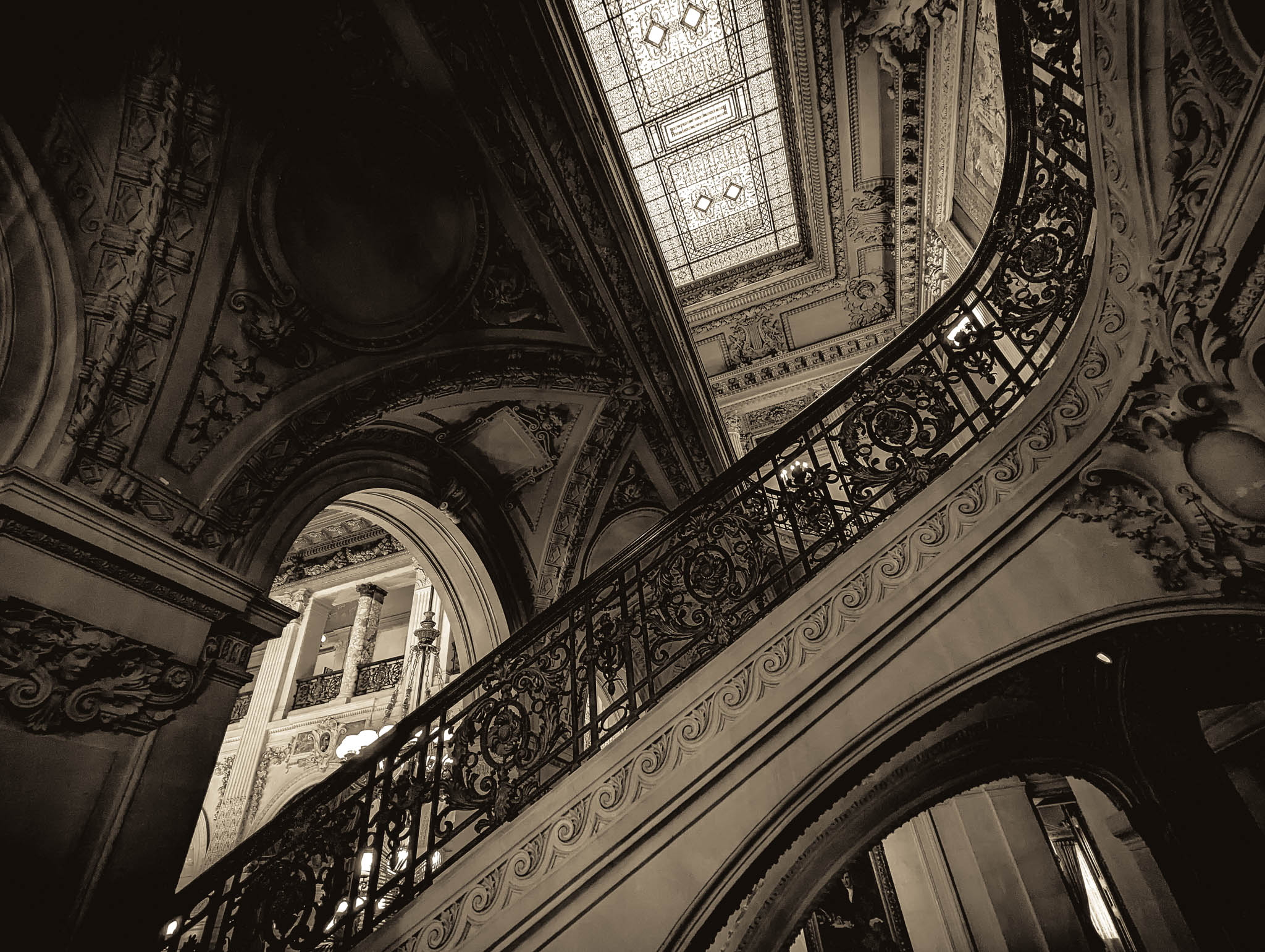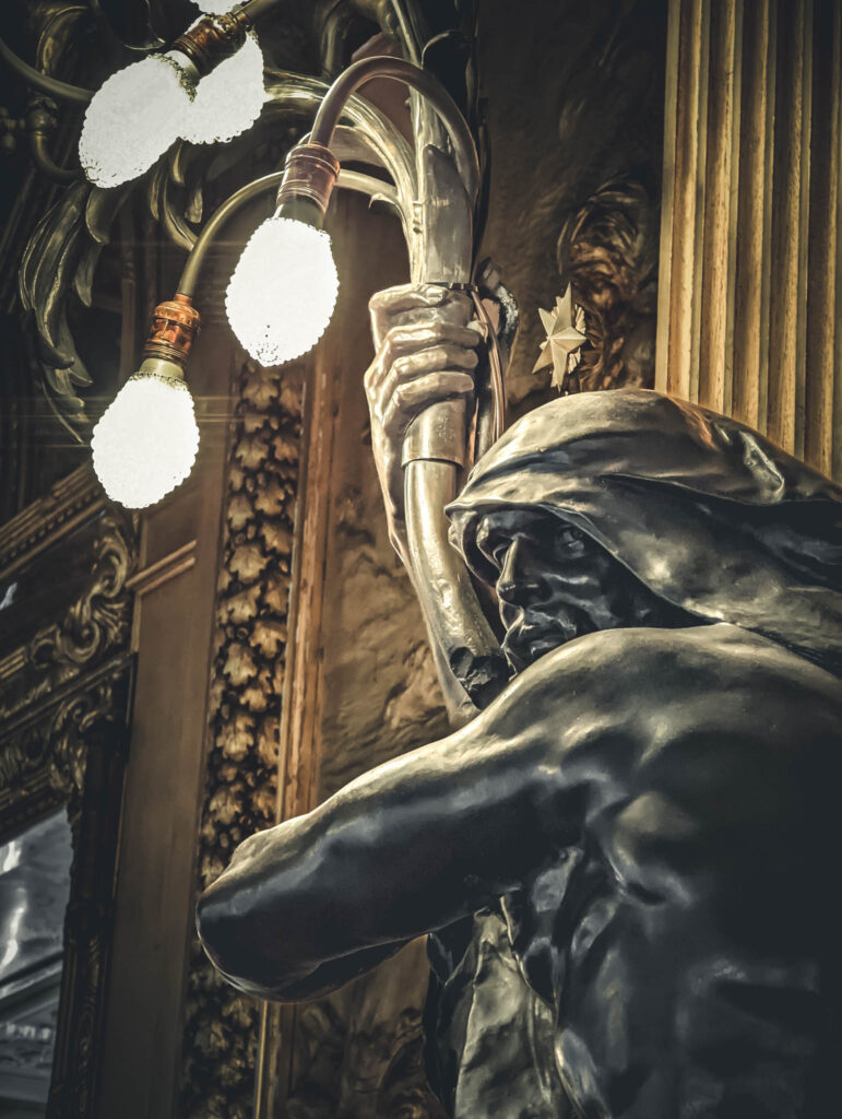 At least Commodore Vanderbilt’s grandkids left the houses for (ultimately) others to admire. Also, my high-hat reflexes aside: there is a quirky melancholy, or even a hint of damnation, in all these gloriously-proportioned and gilded chambers. Faces painted, cast, or carved — many of them smiling but others grim or despairingly lost — are everywhere, leaning out from frames or urns or light-fixtures. And the mirrors! In the reflections it seems my camera caught a more desolate version of reality, cracks in the plaster, rich tints fading to powdery-pastels, spaces as empty and lonely as a foreclosed ruin. This odd sepulchral tinge — was it always there? Does it just “come” with the over-the-top Beaux-Arts? Or did it accumulate over the brief century of Vanderbilt decline since?