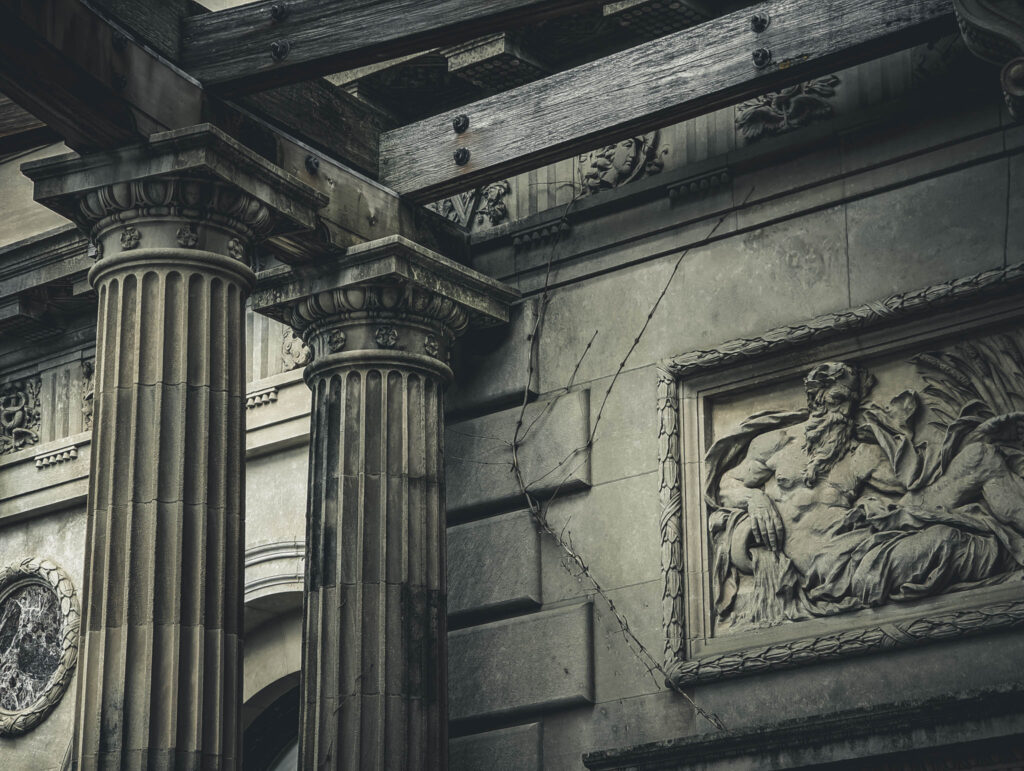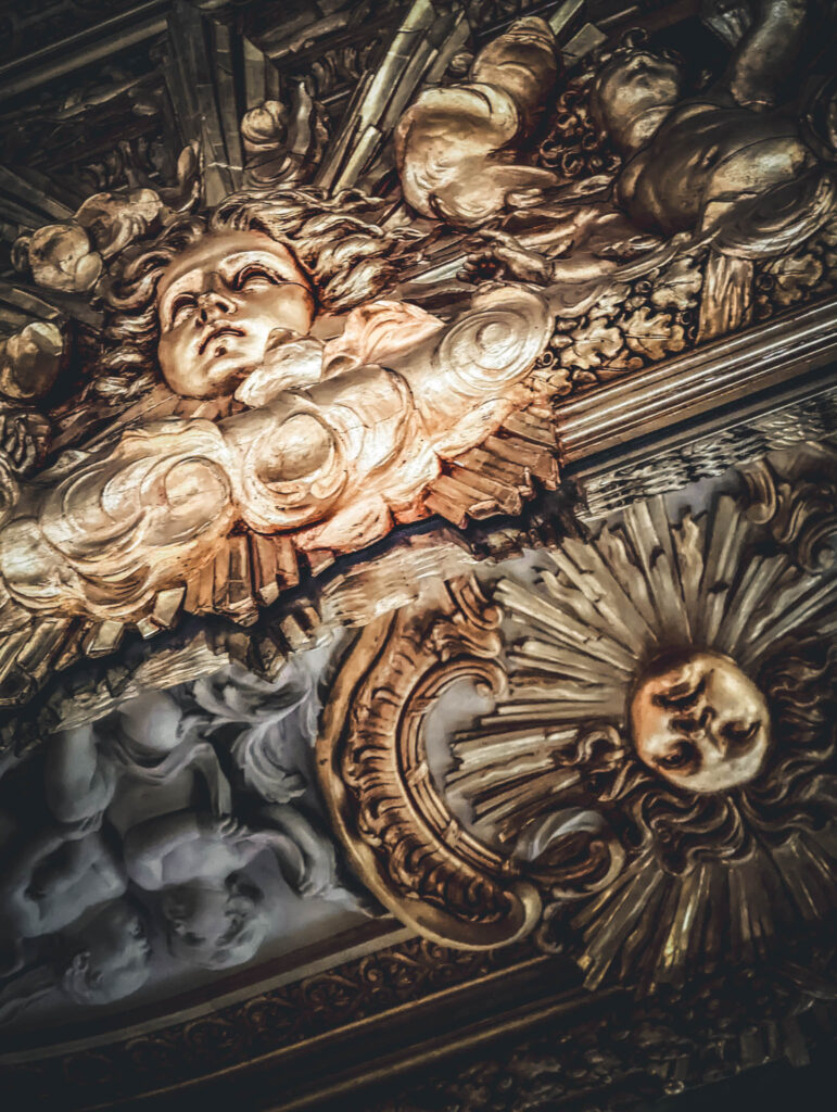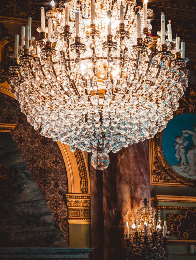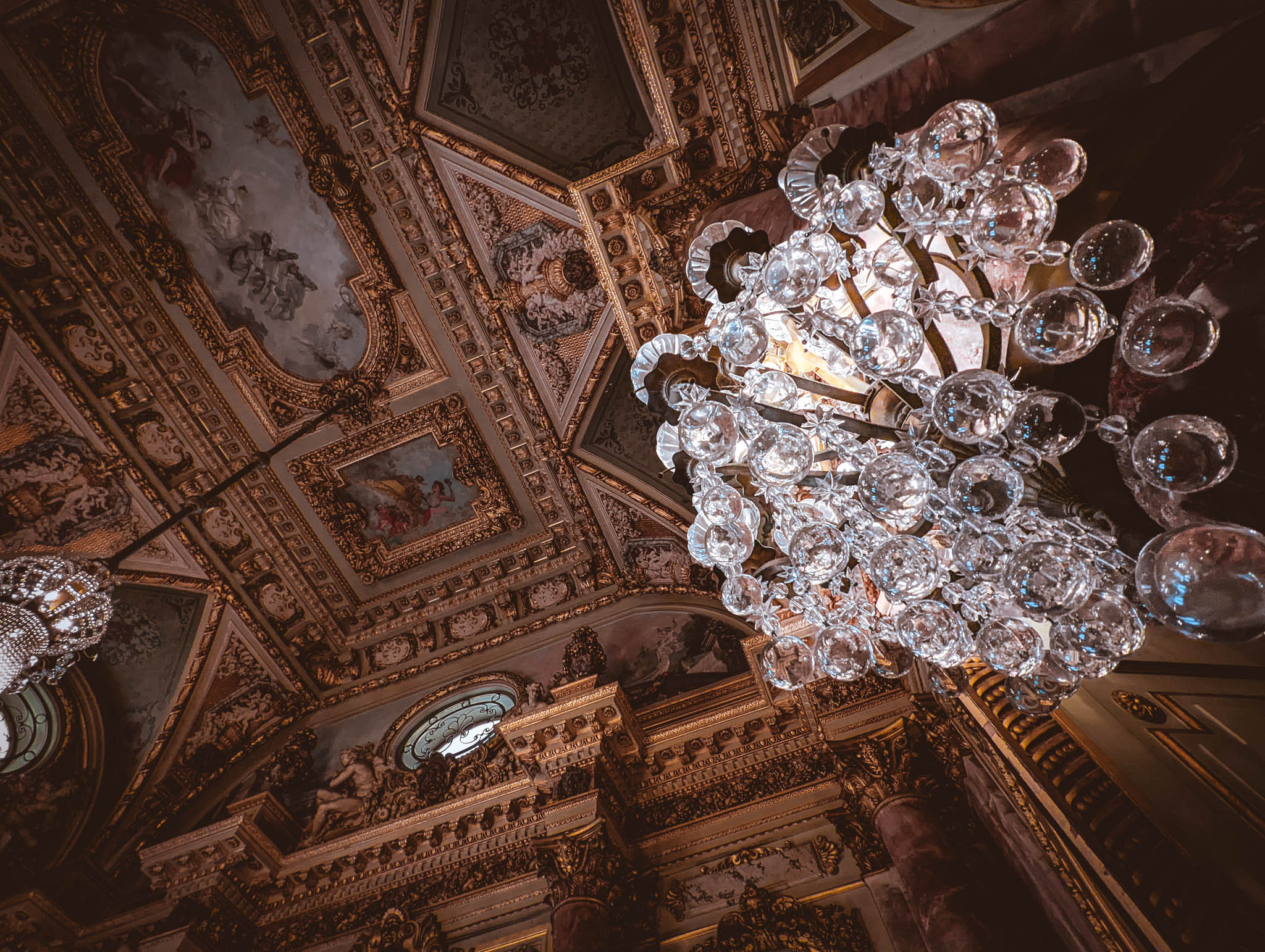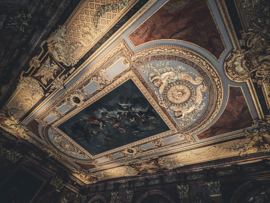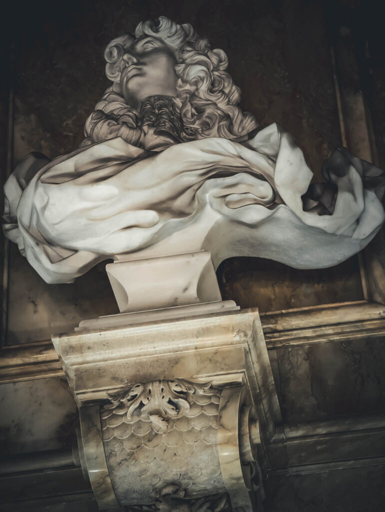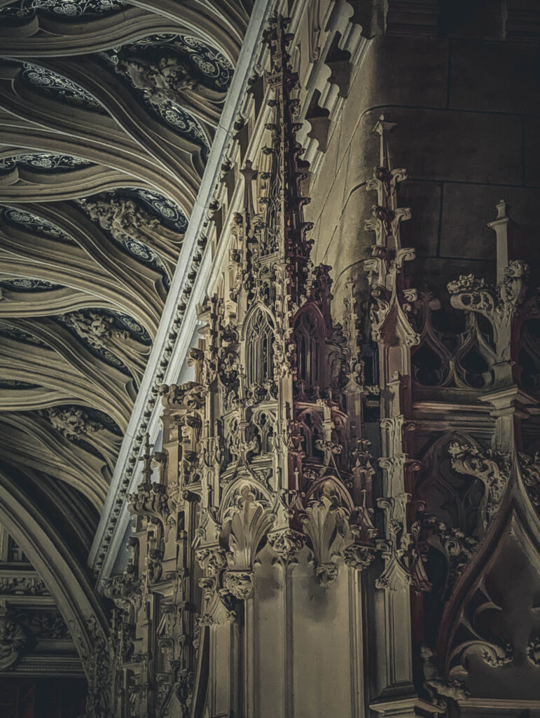At least Commodore Vanderbilt’s grandkids left the houses for (ultimately) others to admire. Also, my high-hat reflexes aside: there is a quirky melancholy, or even a hint of damnation, in all these gloriously-proportioned and gilded chambers. Faces painted, cast, or carved — many of them smiling but others grim or despairingly lost — are everywhere, leaning out from frames or urns or light-fixtures. And the mirrors! In the reflections it seems my camera caught a more desolate version of reality, cracks in the plaster, rich tints fading to powdery-pastels, spaces as empty and lonely as a foreclosed ruin. This odd sepulchral tinge — was it always there? Does it just “come” with the over-the-top Beaux-Arts? Or did it accumulate over the brief century of Vanderbilt decline since?