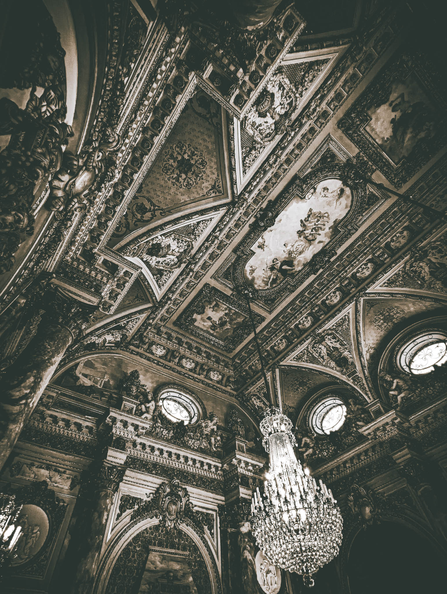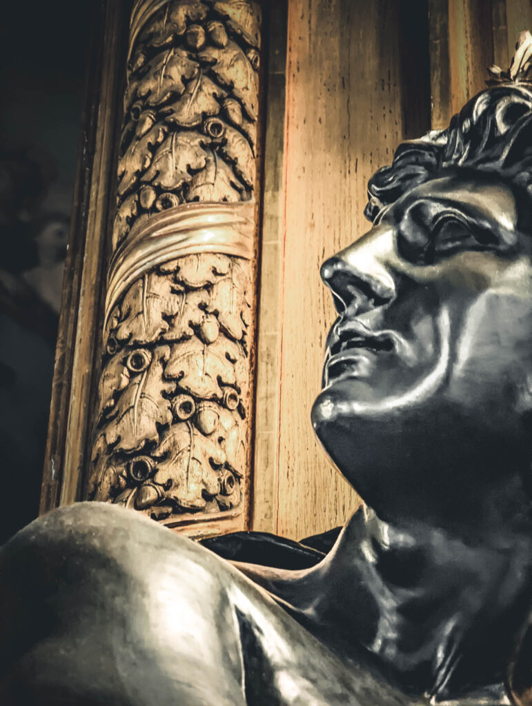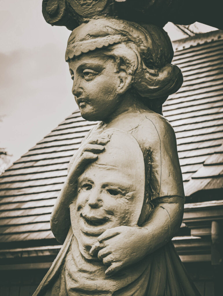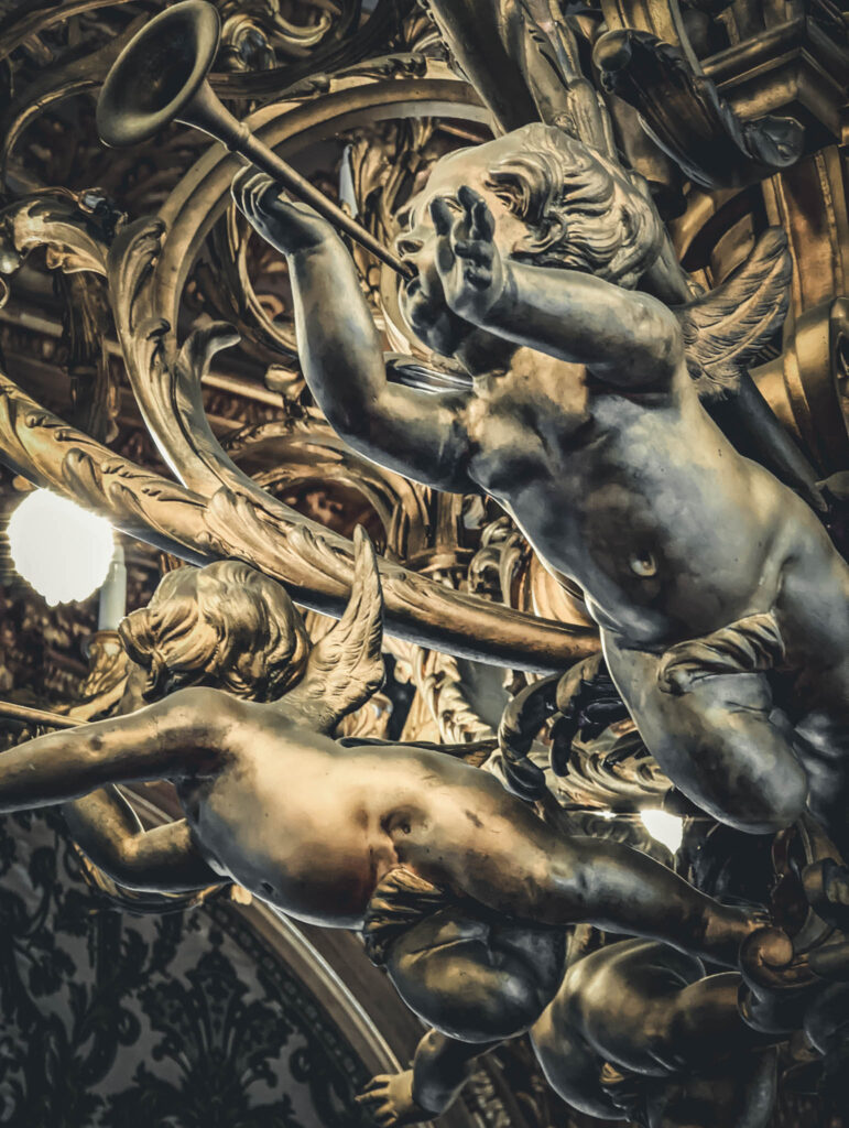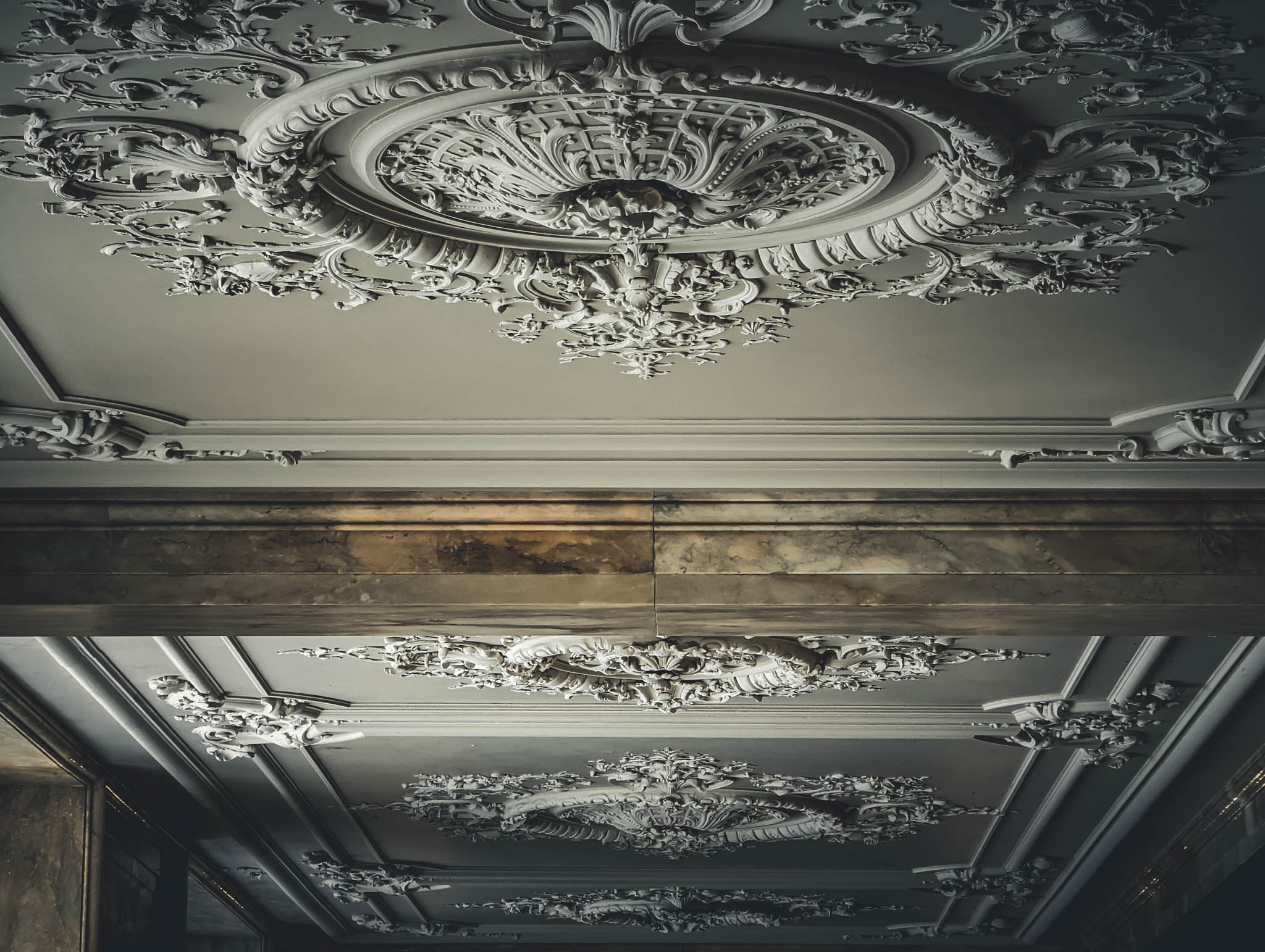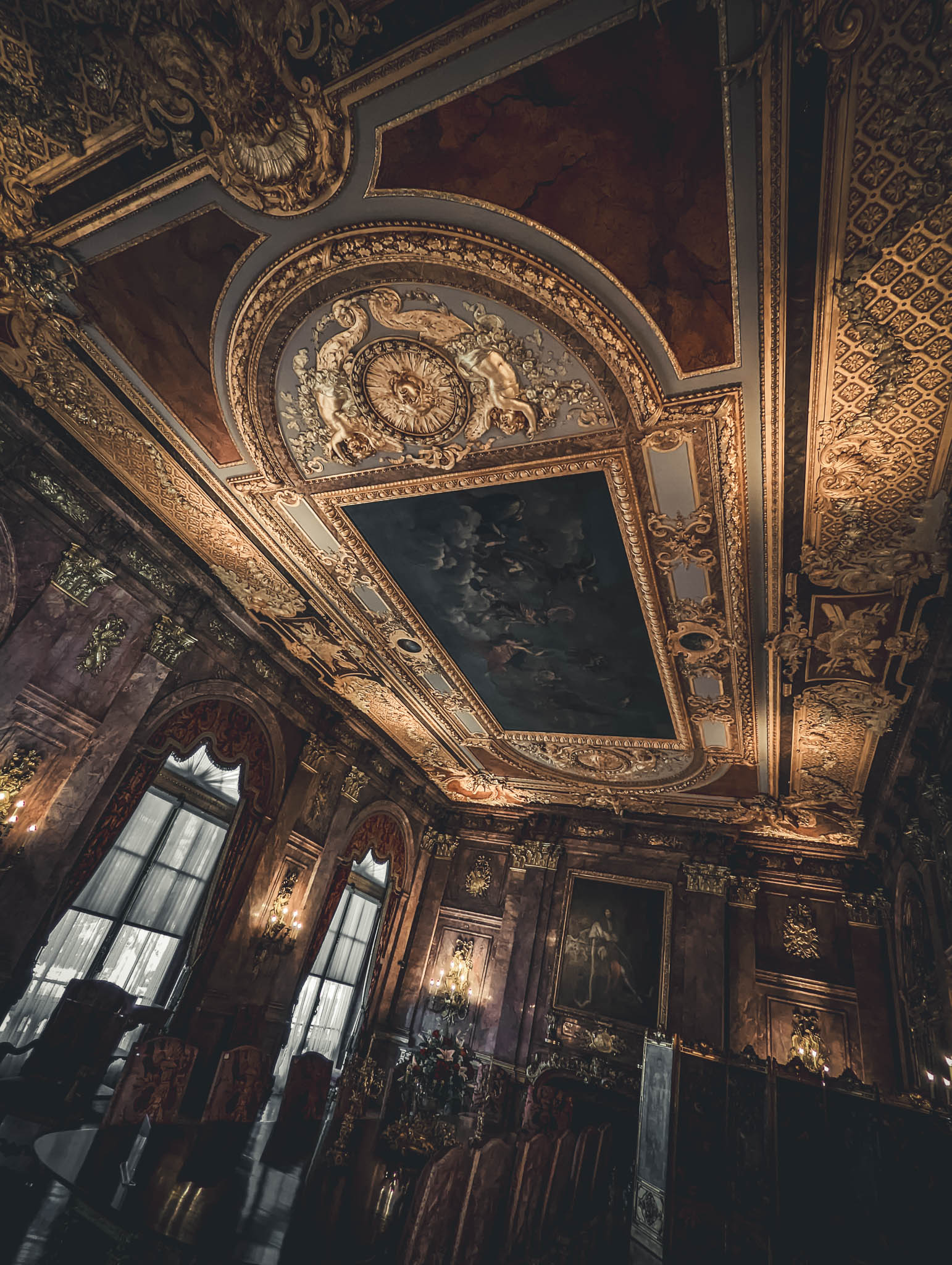 At least Commodore Vanderbilt’s grandkids left the houses for (ultimately) others to admire. Also, my high-hat reflexes aside: there is a quirky melancholy, or even a hint of damnation, in all these gloriously-proportioned and gilded chambers. Faces painted, cast, or carved — many of them smiling but others grim or despairingly lost — are everywhere, leaning out from frames or urns or light-fixtures. And the mirrors! In the reflections it seems my camera caught a more desolate version of reality, cracks in the plaster, rich tints fading to powdery-pastels, spaces as empty and lonely as a foreclosed ruin. This odd sepulchral tinge — was it always there? Does it just “come” with the over-the-top Beaux-Arts? Or did it accumulate over the brief century of Vanderbilt decline since?