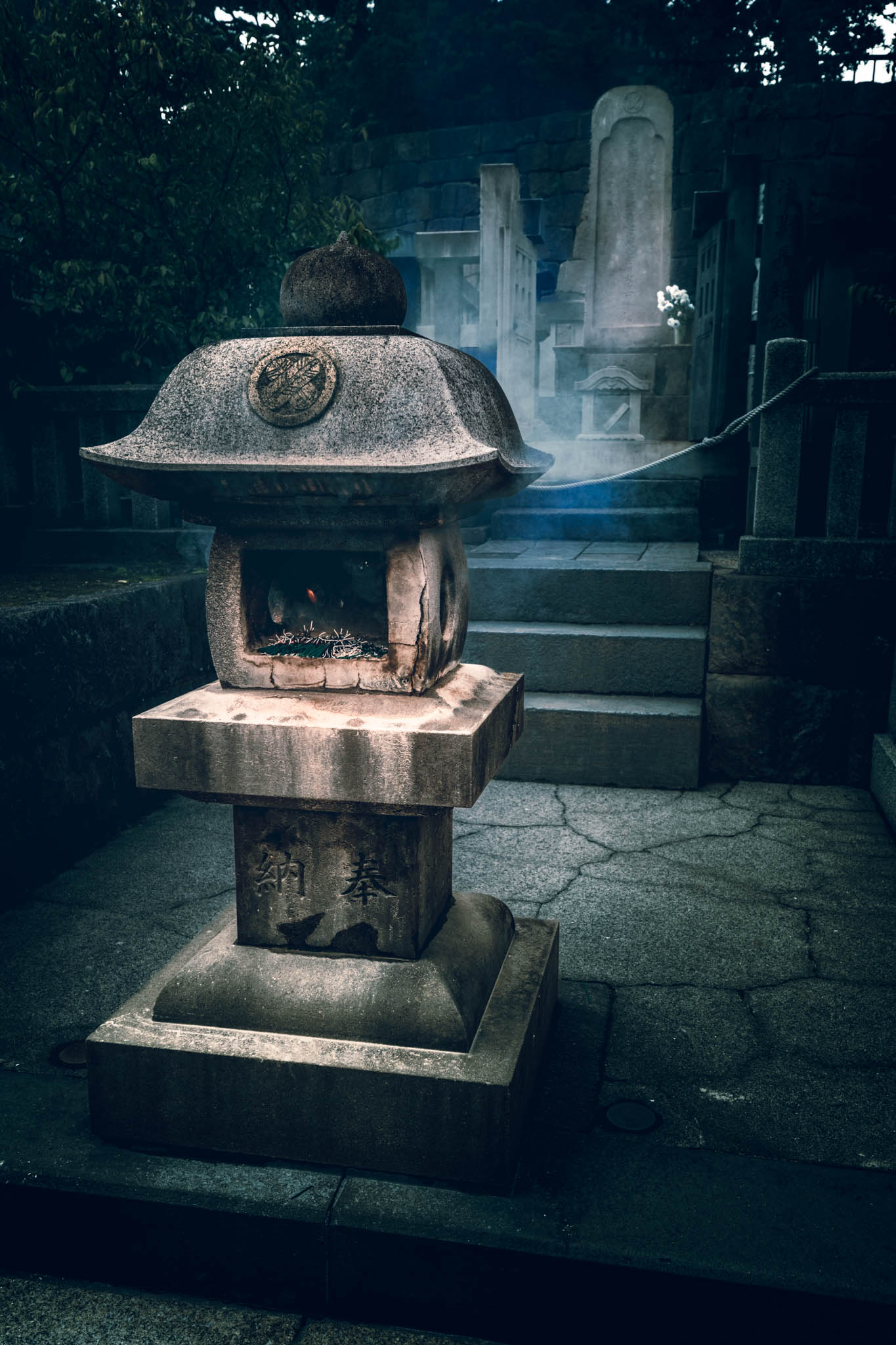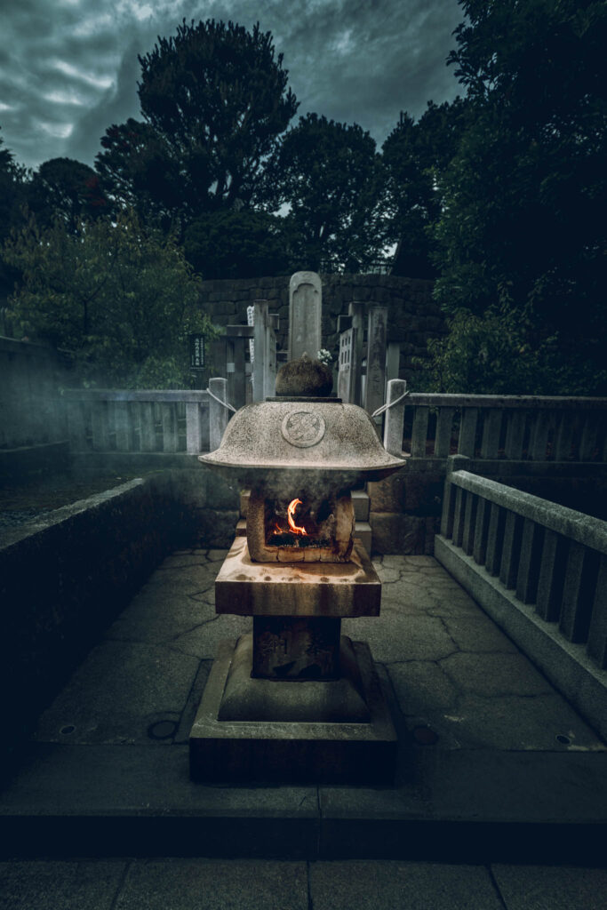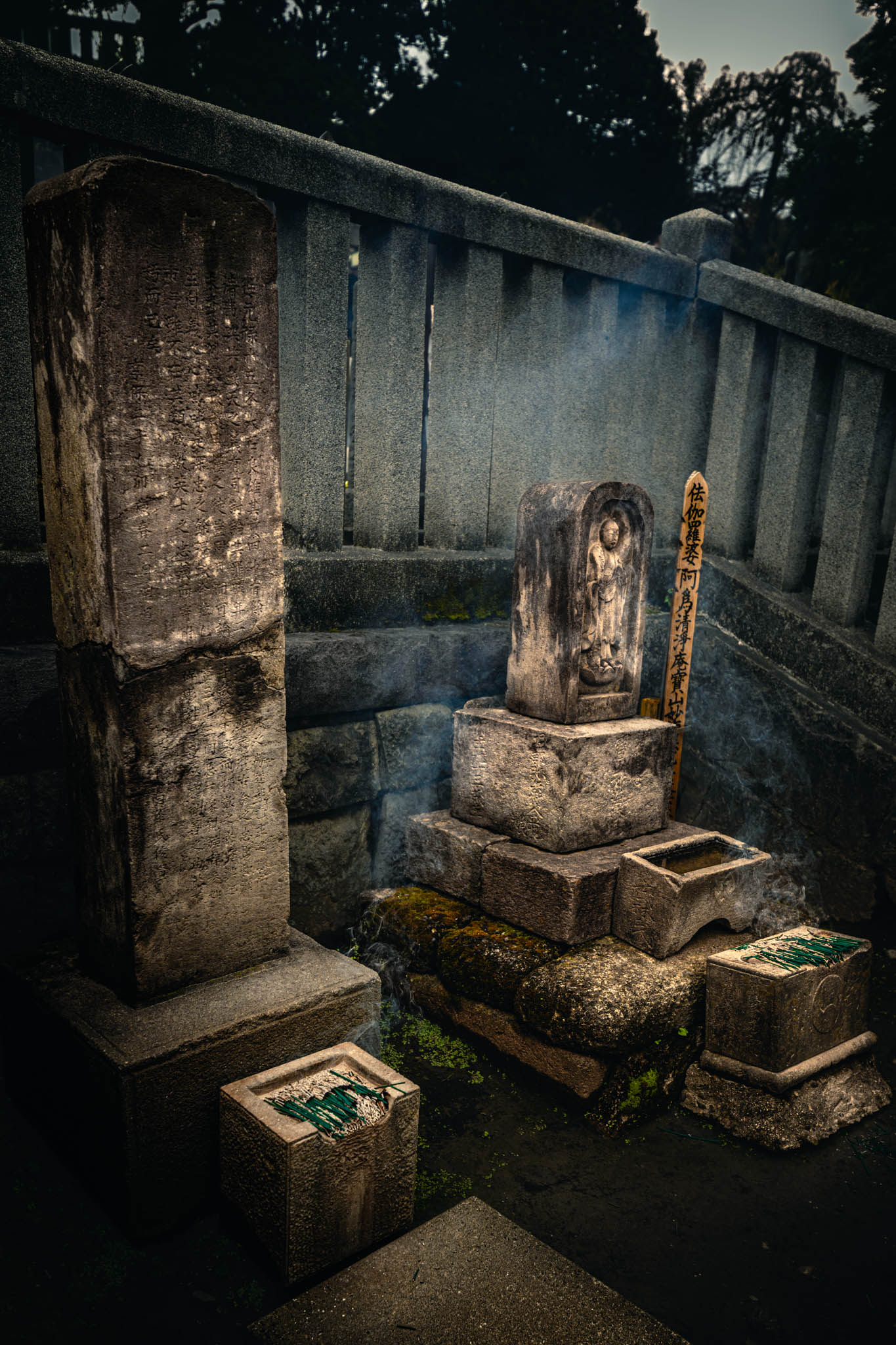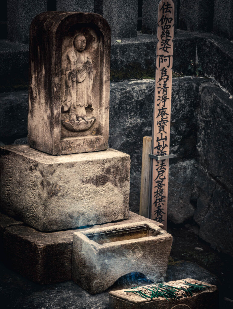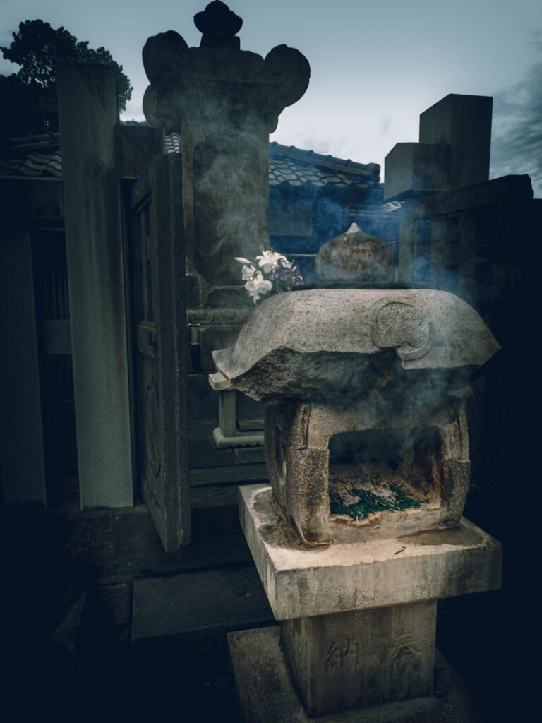 So reasonably, one should place two of the little burning sticks in front of each monument. Circulating among the graves and through the drifting bluish scented clouds of smoke in the growing shadows, I found myself preoccupied with anxiety that I was going to run out sticks before I ran out of graves. Had I “done” this monument — or that one — already? What if I short-changed one or more of the vengeful ronin? Would they be offended?