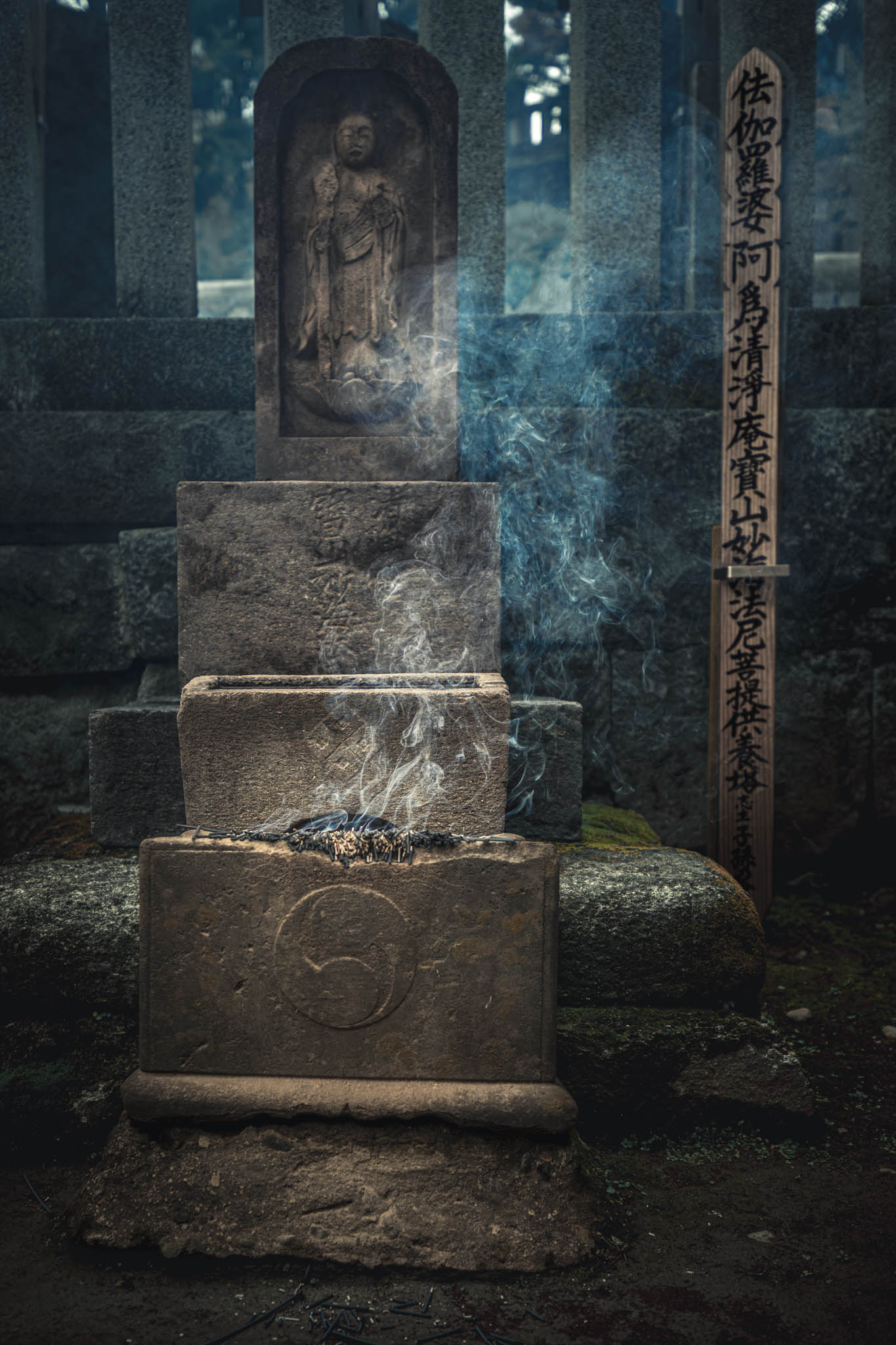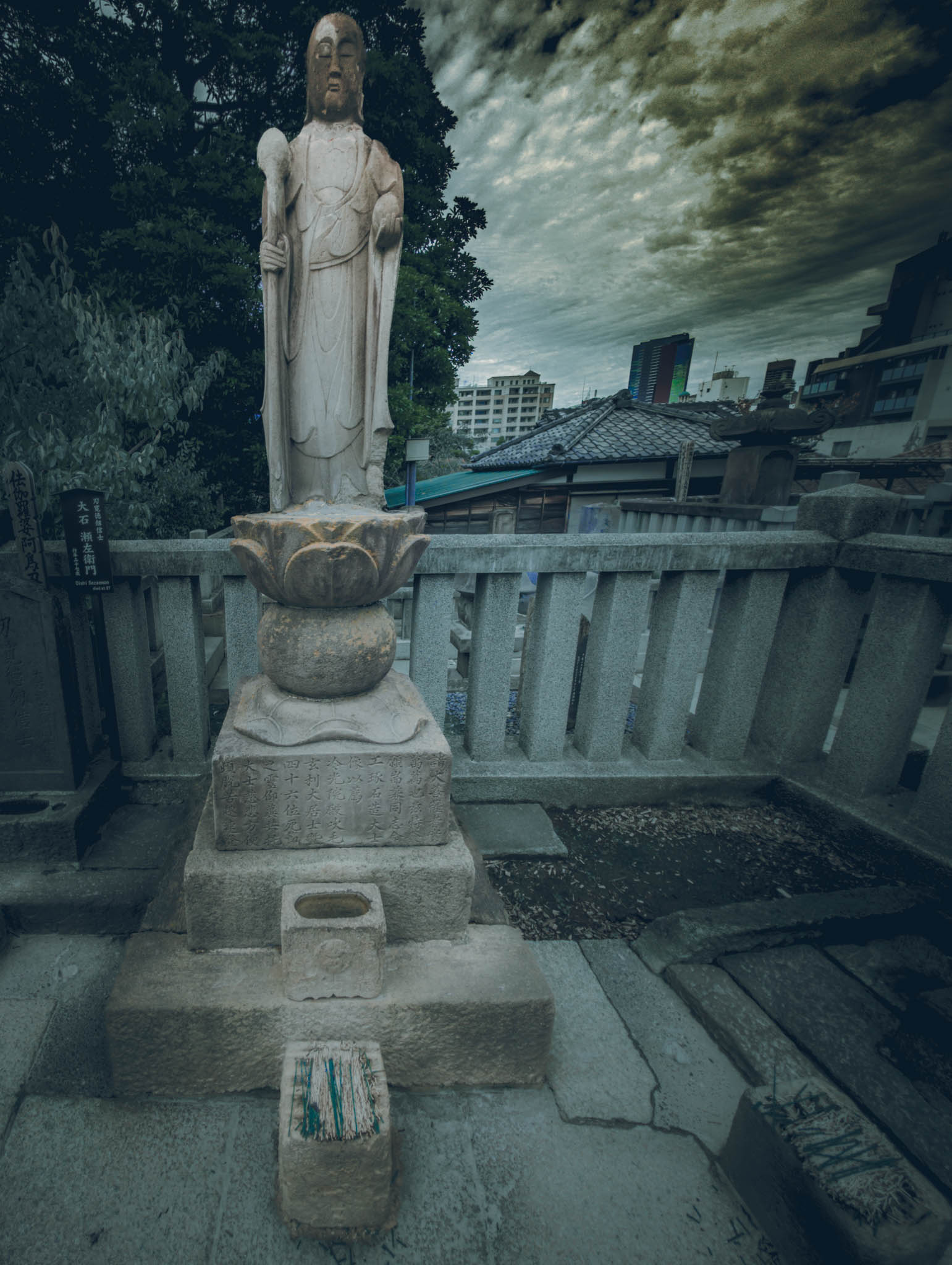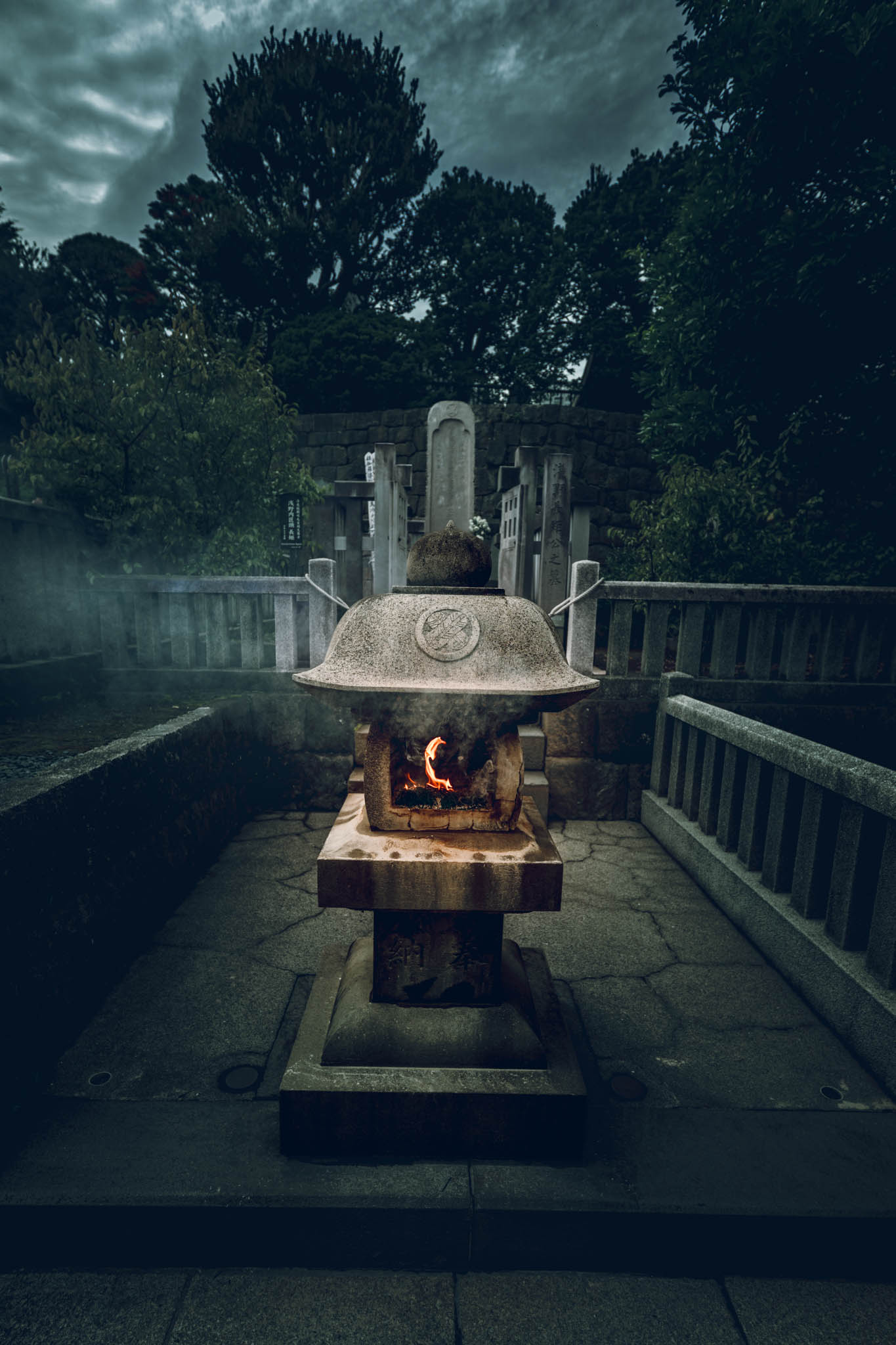 So reasonably, one should place two of the little burning sticks in front of each monument. Circulating among the graves and through the drifting bluish scented clouds of smoke in the growing shadows, I found myself preoccupied with anxiety that I was going to run out sticks before I ran out of graves. Had I “done” this monument — or that one — already? What if I short-changed one or more of the vengeful ronin? Would they be offended?