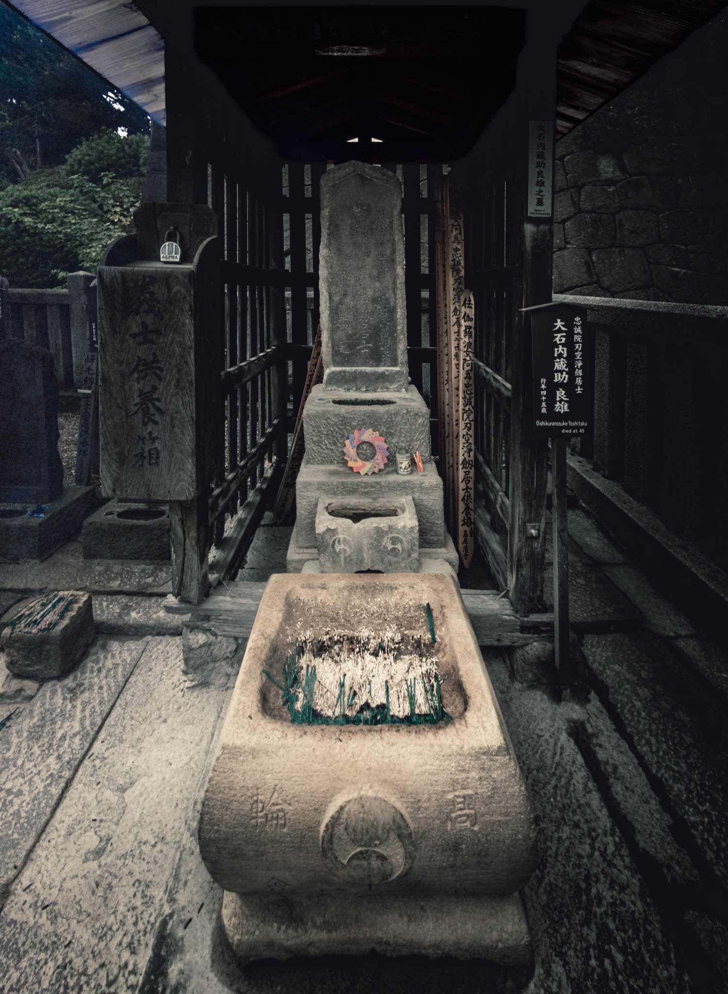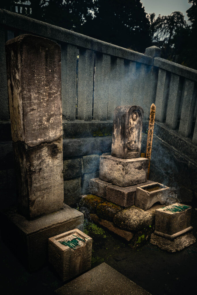 The Ako Gishi area, a perennial place of pilgrimage adjoining the temple, is a small set of terraces past the famous well where Lord Kira’s head was washed by the ronin and entered through a gate salvaged from the Asano mansion. The graves themselves consist, for each of the interred except the lord and his lady, of a stone stele and accompanying wooden sotoba, wooden strips that act as a kind of vestigial Buddhist stupa inscribed with identifying information and prayers. To walk among the monuments one must spend 500 yen on a bundle of a hundred green-blue joss sticks, which the attendants will helpfully light and place in a section of halved bamboo.