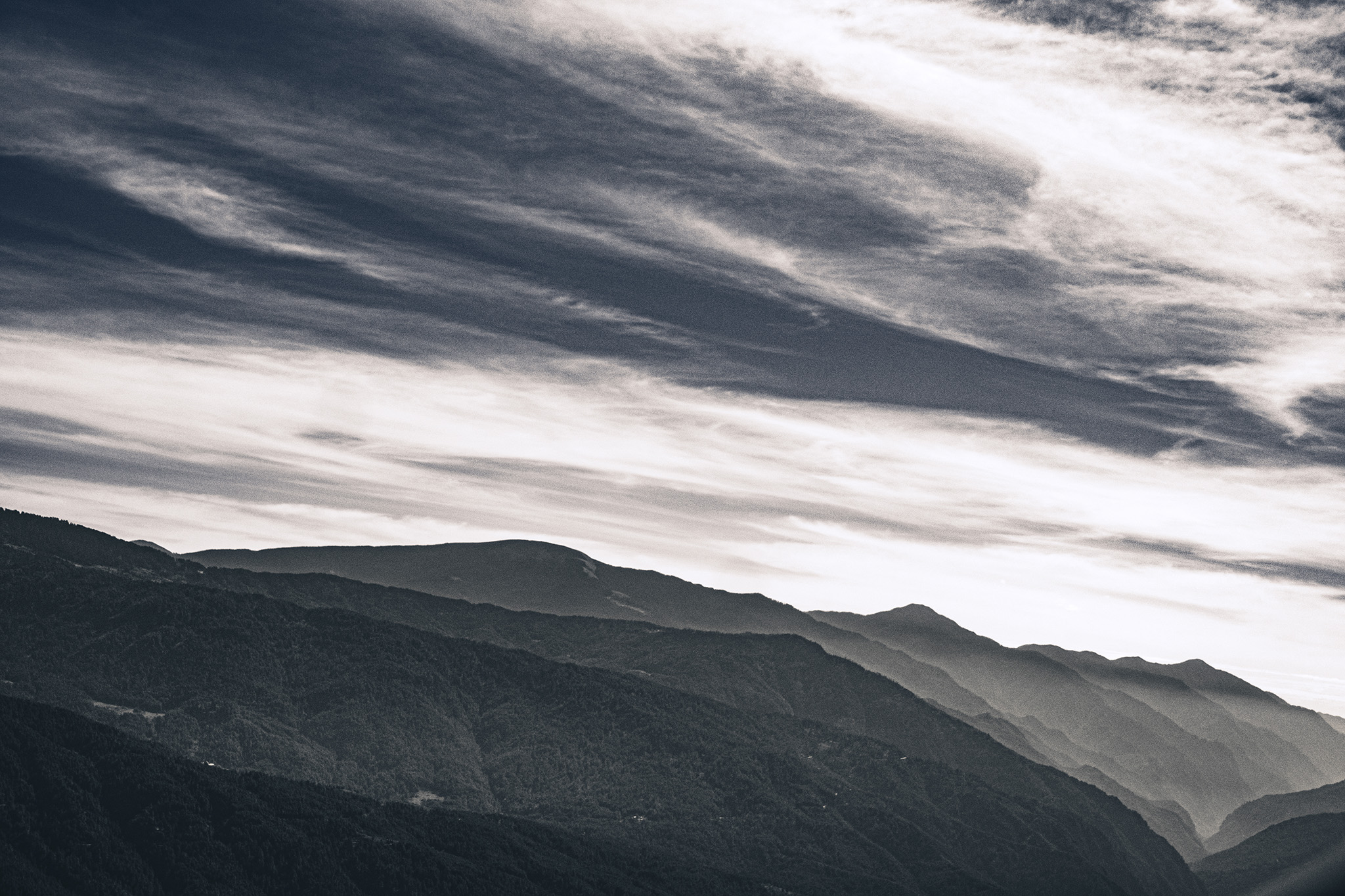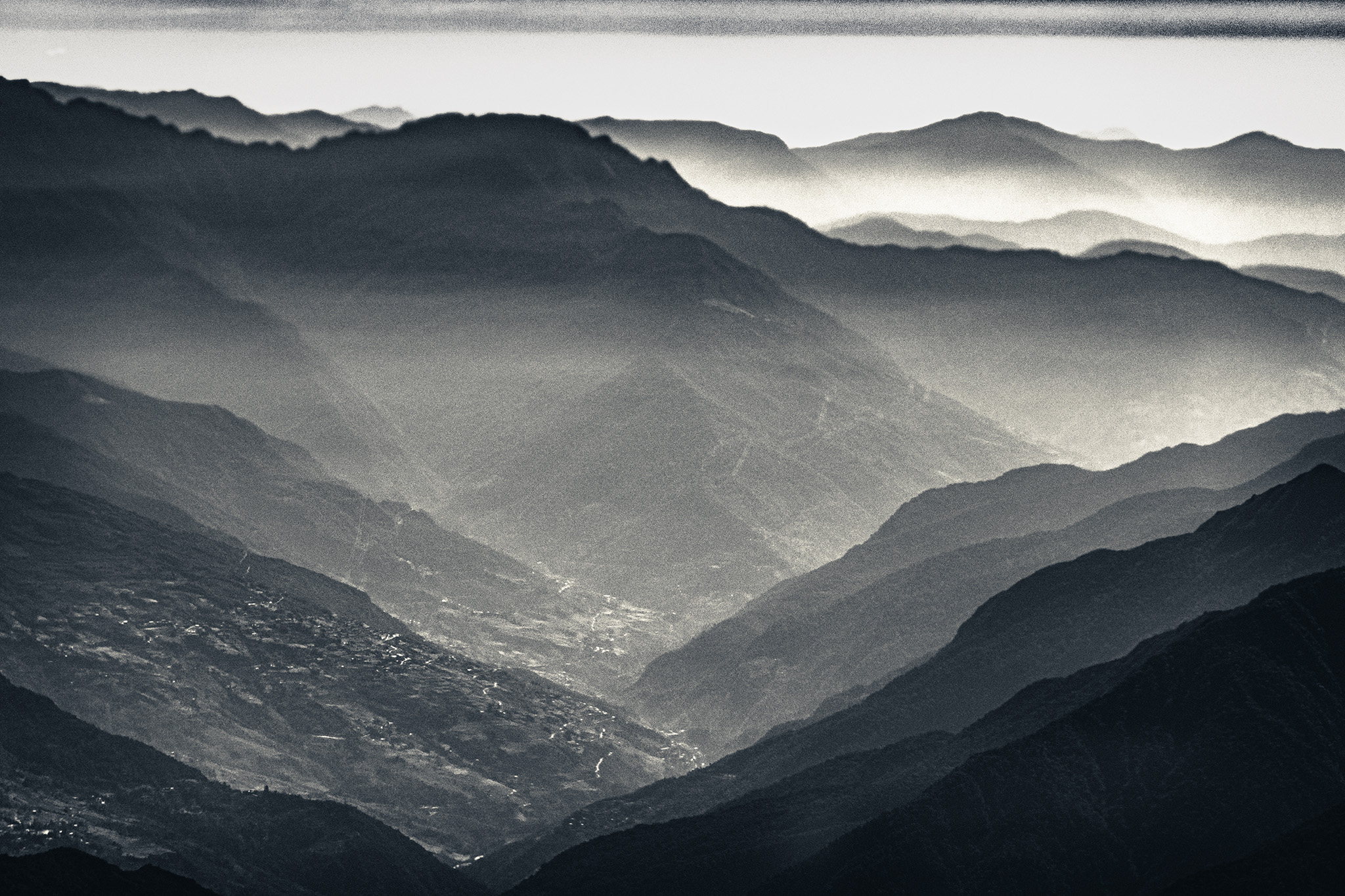 Those deeply corrugated folds of terrain, fuzzed with firs and punctuated with the occasional jagged outcrop of stone, are the Inner Himalayas. Beyond them lay the Duars (which have been described to me as a pestilential jungle), and beyond them in turn is the teaming floodplain of the Brahmaputra, draining India and Bangladesh through Dhaka into the Bay of Bengal. Of course, none of that is visible past the immediate distance, as the ridges and valleys fade into blurs like a Chinese ink landscape. It’s autumn, and the farmers of India are burning the stubble in their harvested fields, with the gathered smoke backing up in Bhutan’s valleys against the bulk of the greater ranges to the north at the Tibetan border.