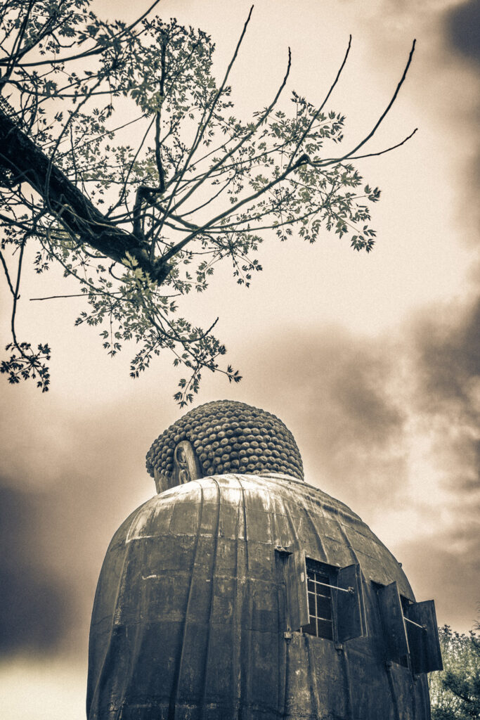 There are windows, very domestic- and modern-seeming windows with casement shutters, in the back (literally, in the figure’s back!) of the Great Buddha of Kamakura at Kōtoku-in. I had known that the Buddha (cast in 1252) was hollow, and that disrespectful early foreign visitors had profaned the interior of the statue with their graffiti, but I hadn’t known about the windows.