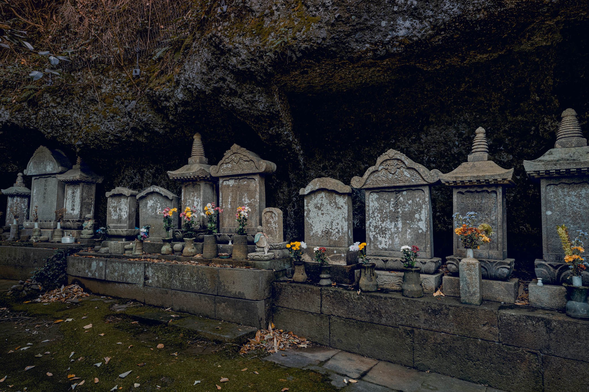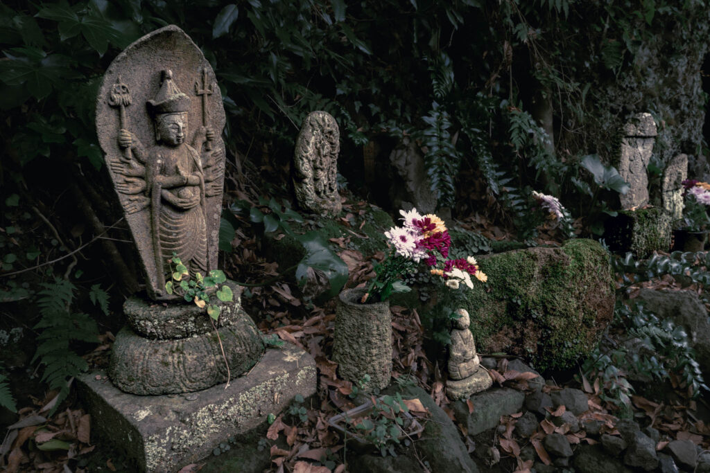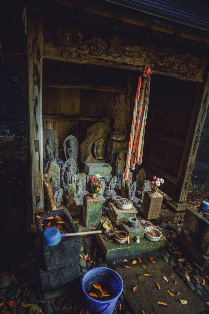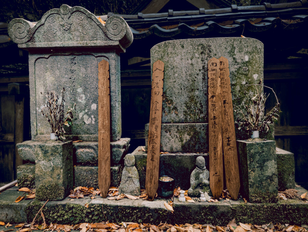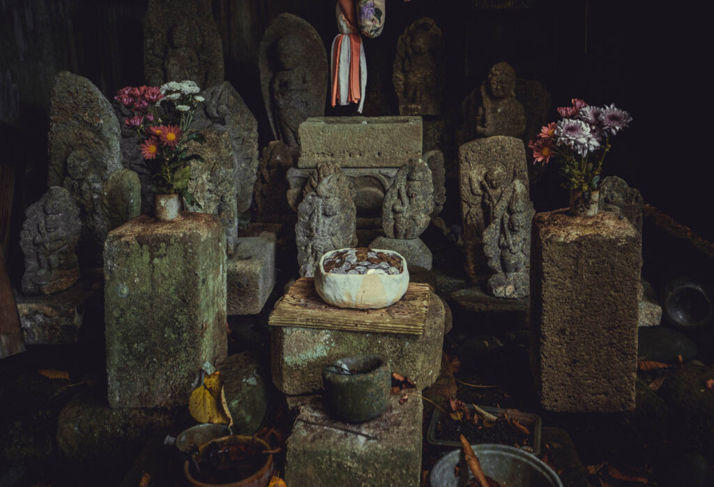 There are no mosquitos today in the odd graveyard of Shokoji, the old Ji-shū Buddhist temple past the Hakusan Shrine in the dark, forested narrow end of the valley that holds the compact miniature-Venice-like village of Shukunegi on Sado Island. It’s late fall, and a little chilly, not the breeding season for hungry insects. The graveyard is also very compact, and multi-level, with additional monuments tucked into cavities carved above head-height in the tufa cliff at the back. It’s not clear that is abandoned, entirely, either: many of the markers have fresh chrysanthemums and carnations in their vases and basins. While I am there, two polite village men in day-glo high-visibility vests nod at us, on their way to examine a tree branch that is hanging worryingly low over the temple eaves. But the precinct is almost abandoned: our guide, the generous historian Fujiko Maeda (who has an office at the tourist information center at the mouth of the valley) explains that there has been no resident Buddhist priest for years; at great expense a monk from elsewhere must be brought to perform any necessary funeral rites, since exequies are exclusively the provenance of Buddhism within the complex framework of religious traditions in Japan.