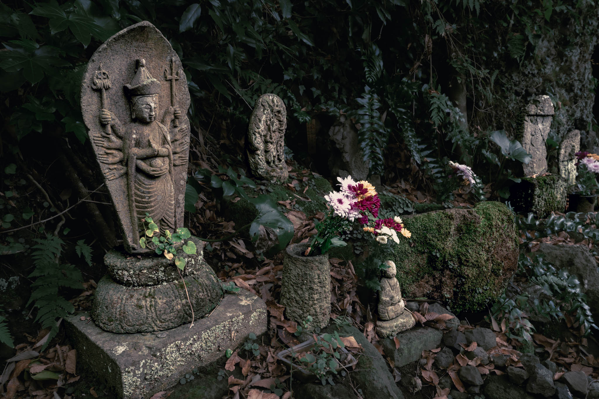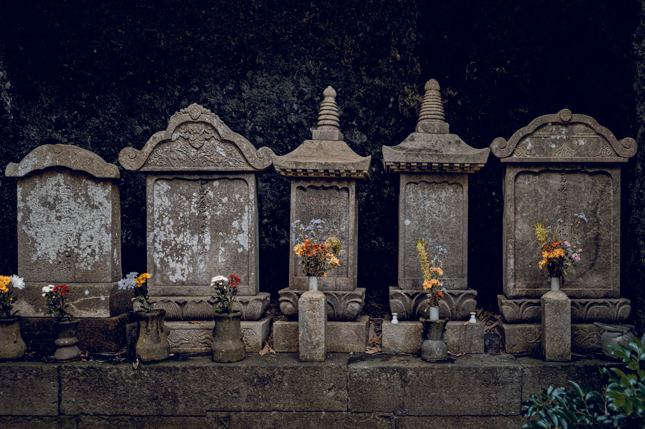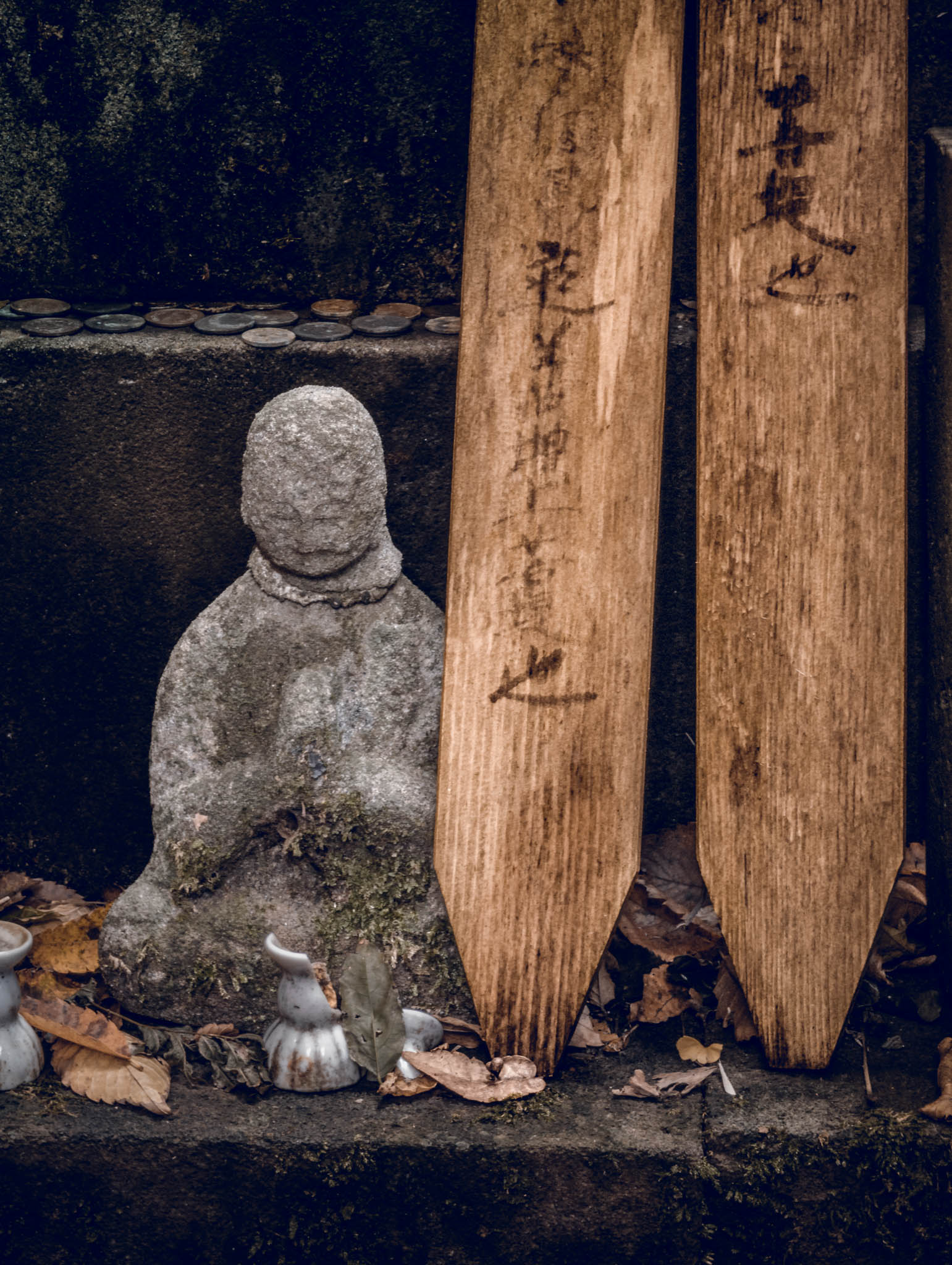 There are no mosquitos today in the odd graveyard of Shokoji, the old Ji-shū Buddhist temple past the Hakusan Shrine in the dark, forested narrow end of the valley that holds the compact miniature-Venice-like village of Shukunegi on Sado Island. It’s late fall, and a little chilly, not the breeding season for hungry insects. The graveyard is also very compact, and multi-level, with additional monuments tucked into cavities carved above head-height in the tufa cliff at the back. It’s not clear that is abandoned, entirely, either: many of the markers have fresh chrysanthemums and carnations in their vases and basins. While I am there, two polite village men in day-glo high-visibility vests nod at us, on their way to examine a tree branch that is hanging worryingly low over the temple eaves. But the precinct is almost abandoned: our guide, the generous historian Fujiko Maeda (who has an office at the tourist information center at the mouth of the valley) explains that there has been no resident Buddhist priest for years; at great expense a monk from elsewhere must be brought to perform any necessary funeral rites, since exequies are exclusively the provenance of Buddhism within the complex framework of religious traditions in Japan.