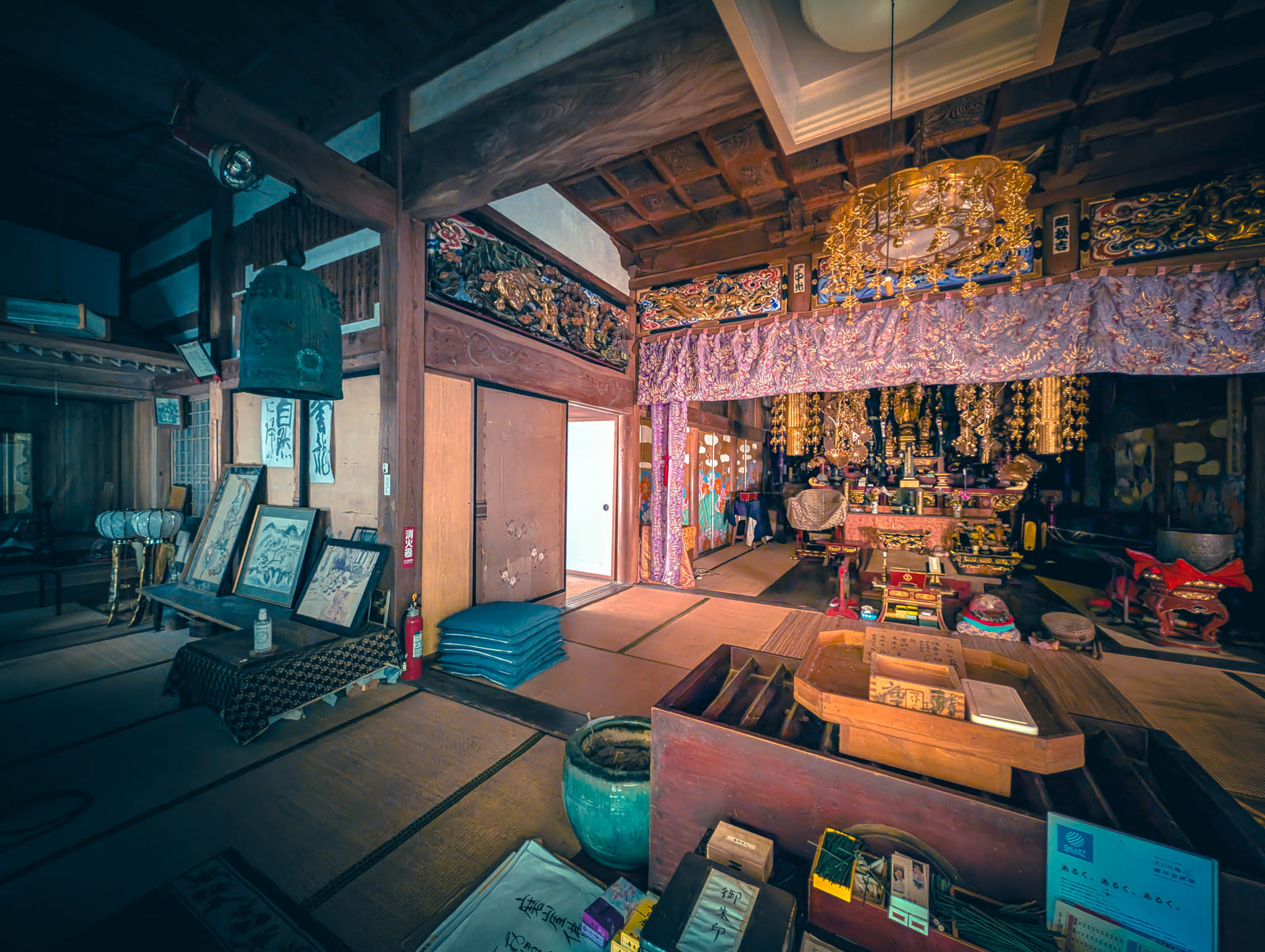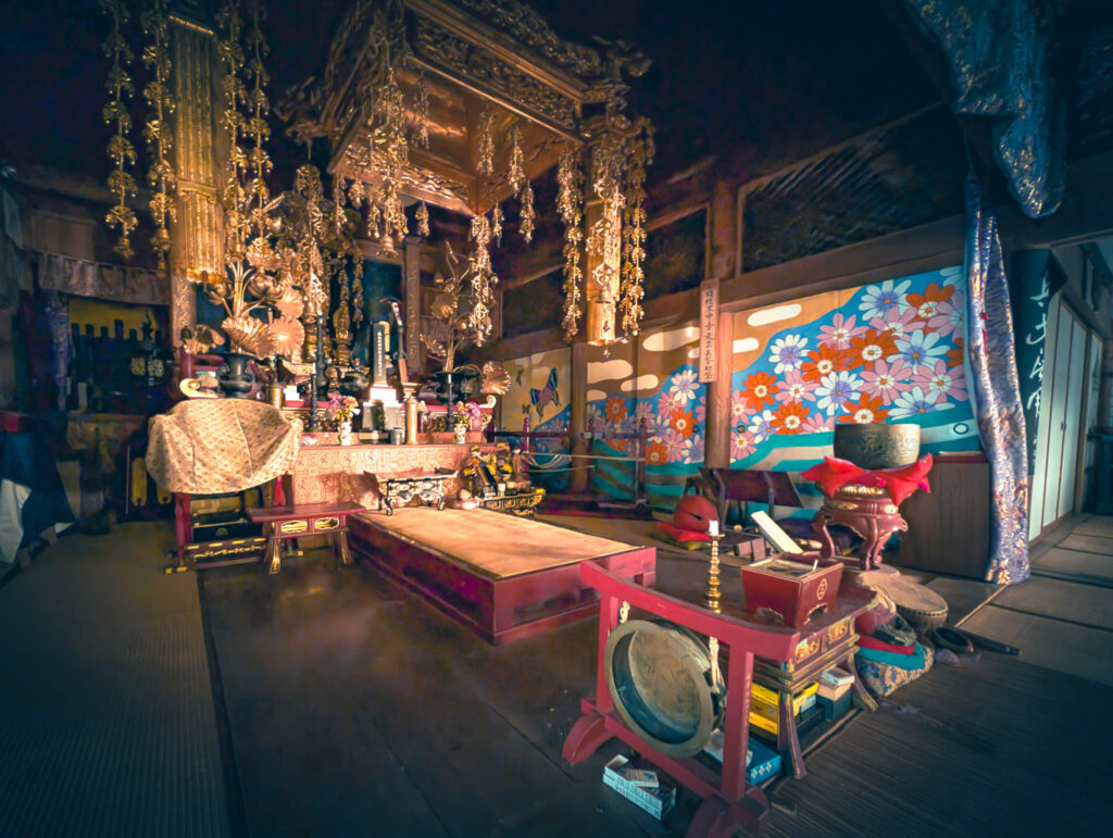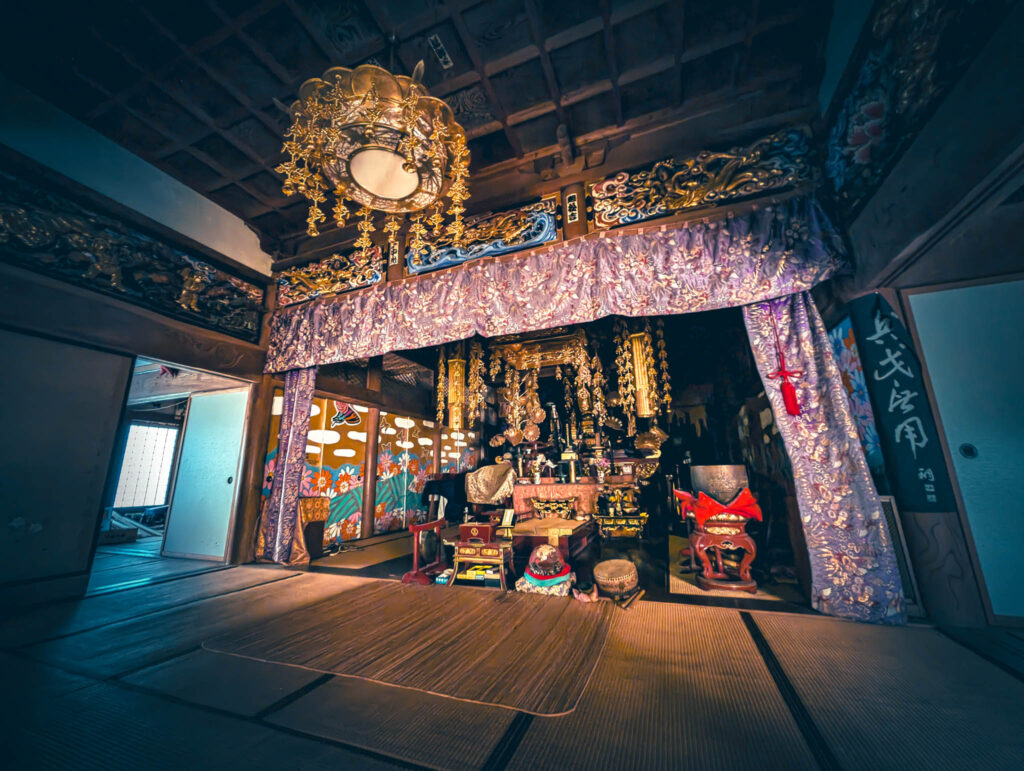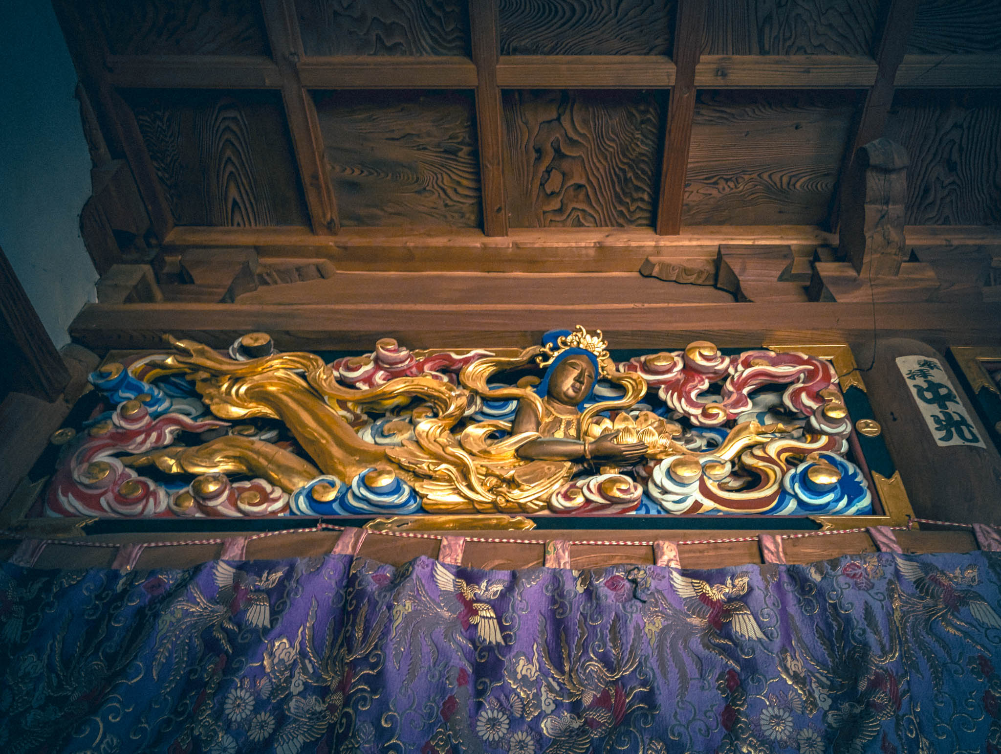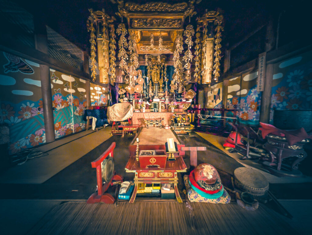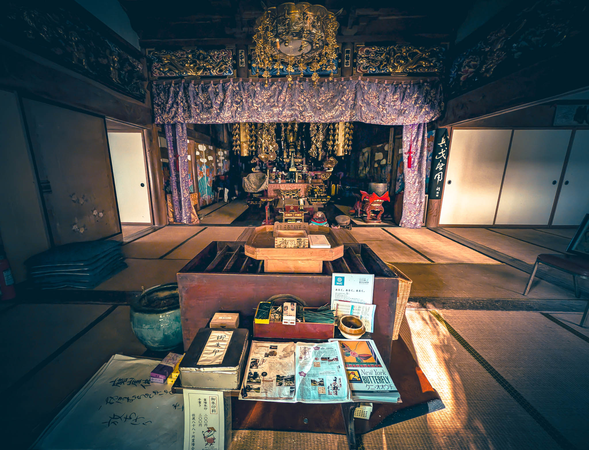 But Fujiko-san knows the sister of the late previous vicar, and she insists it is quite all right when she pulls open the sliding doors of the small Benten-shrine and then the larger hondo. Both buildings have begun to assume the aspect of an attic, basement, or garden shed, cluttered with stuff of the household that can’t be used but can’t be easily thrown away. No one knows what to do with the various accouterments, the ritual paraphernalia and sacred artifacts that apparently used to be positioned around the garan. So it has all been brought inside and piled on the tatami, somewhat precariously, in the corners and against the walls, until the day when a new priest revitalizes the place. (That doesn’t seem likely; Shukunegi, like all of Sado and much of Japan once you get away from the great southern and eastern cities of Honshu, is increasingly depopulated.)