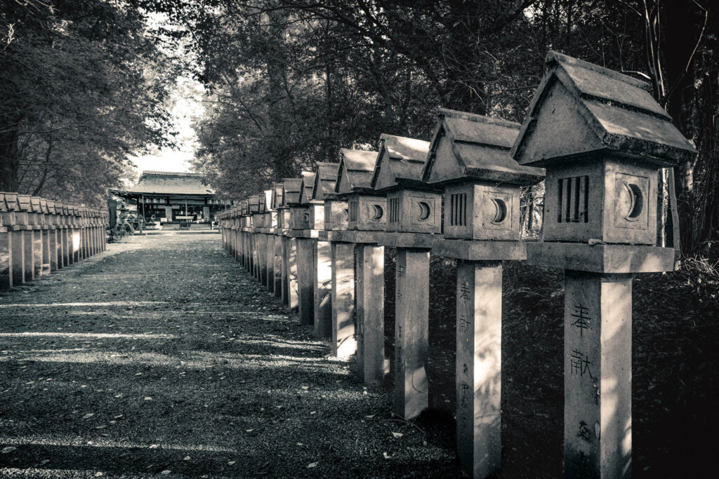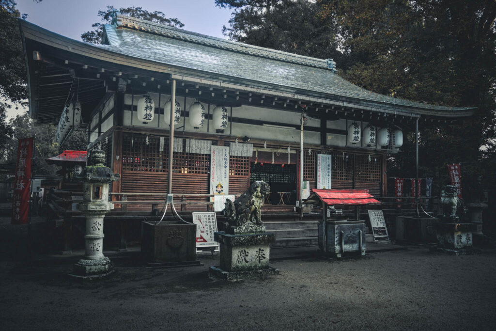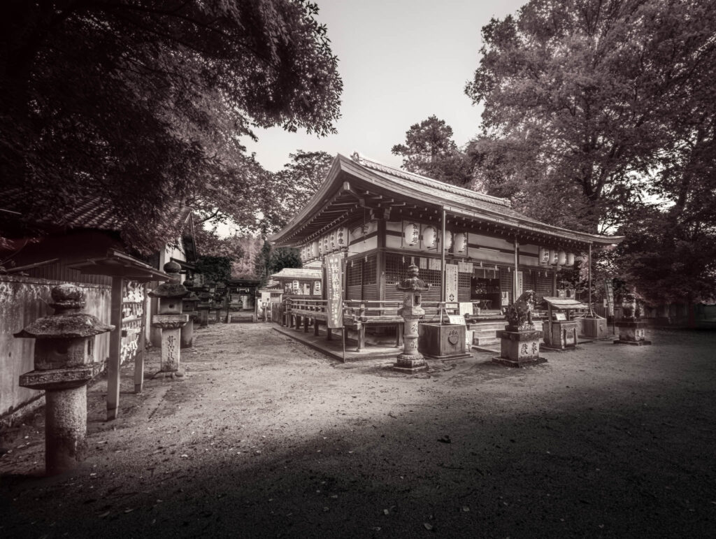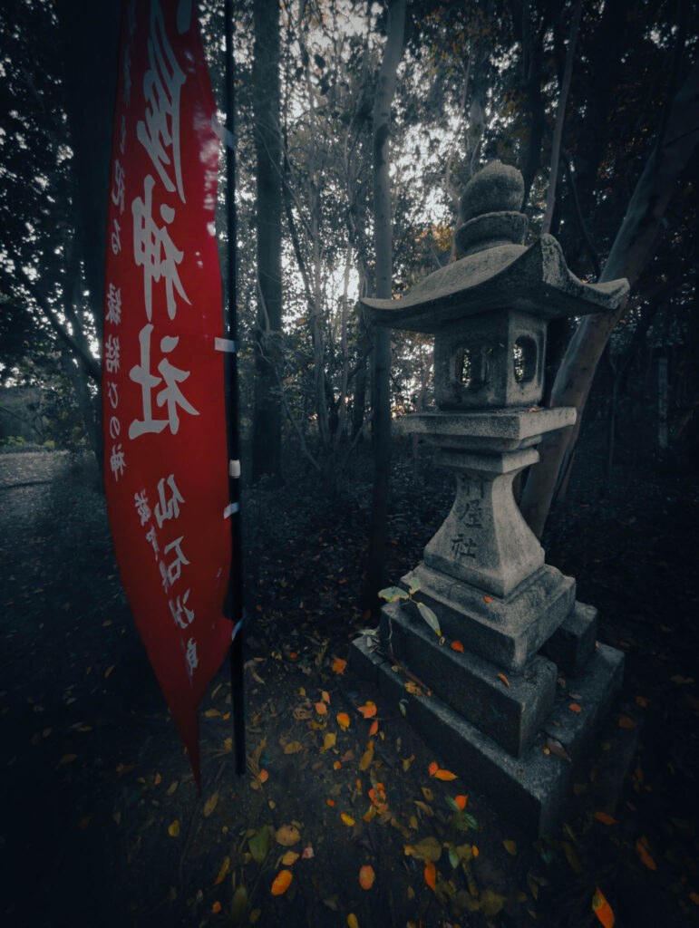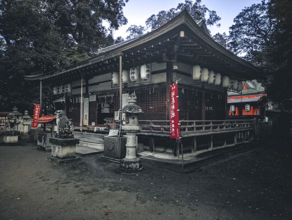 Small clumps of trees occasionally erupt and interrupt the monotonous agricultural geometry. If Google Maps is to be believed, these inevitably indicate the kofun barrow of an ancient aristocrat or else the precincts of a Shinto shrine. One of these remnant-forested shrines — in fact, one of the largest in the immediate area — is situated within a few yards of the hotel-cum-factory.
