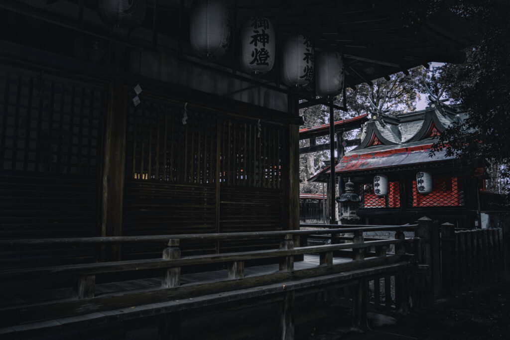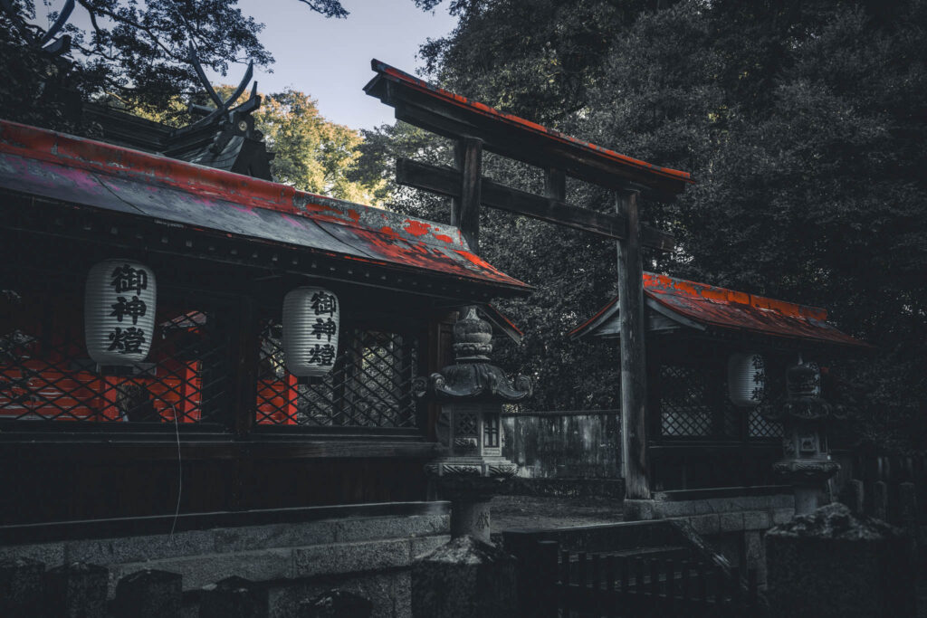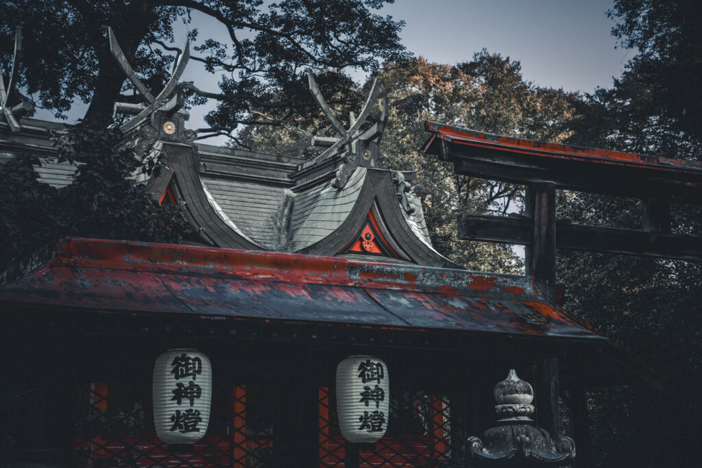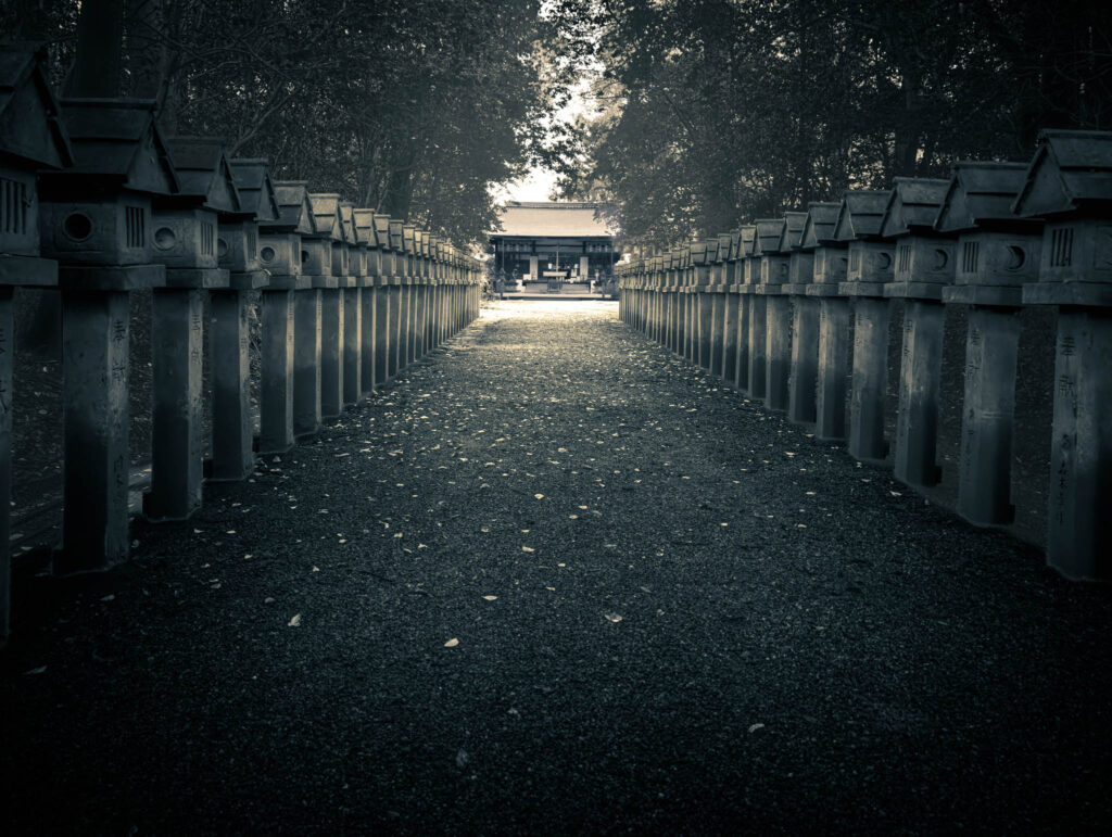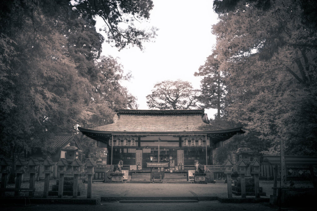 Small clumps of trees occasionally erupt and interrupt the monotonous agricultural geometry. If Google Maps is to be believed, these inevitably indicate the kofun barrow of an ancient aristocrat or else the precincts of a Shinto shrine. One of these remnant-forested shrines — in fact, one of the largest in the immediate area — is situated within a few yards of the hotel-cum-factory.