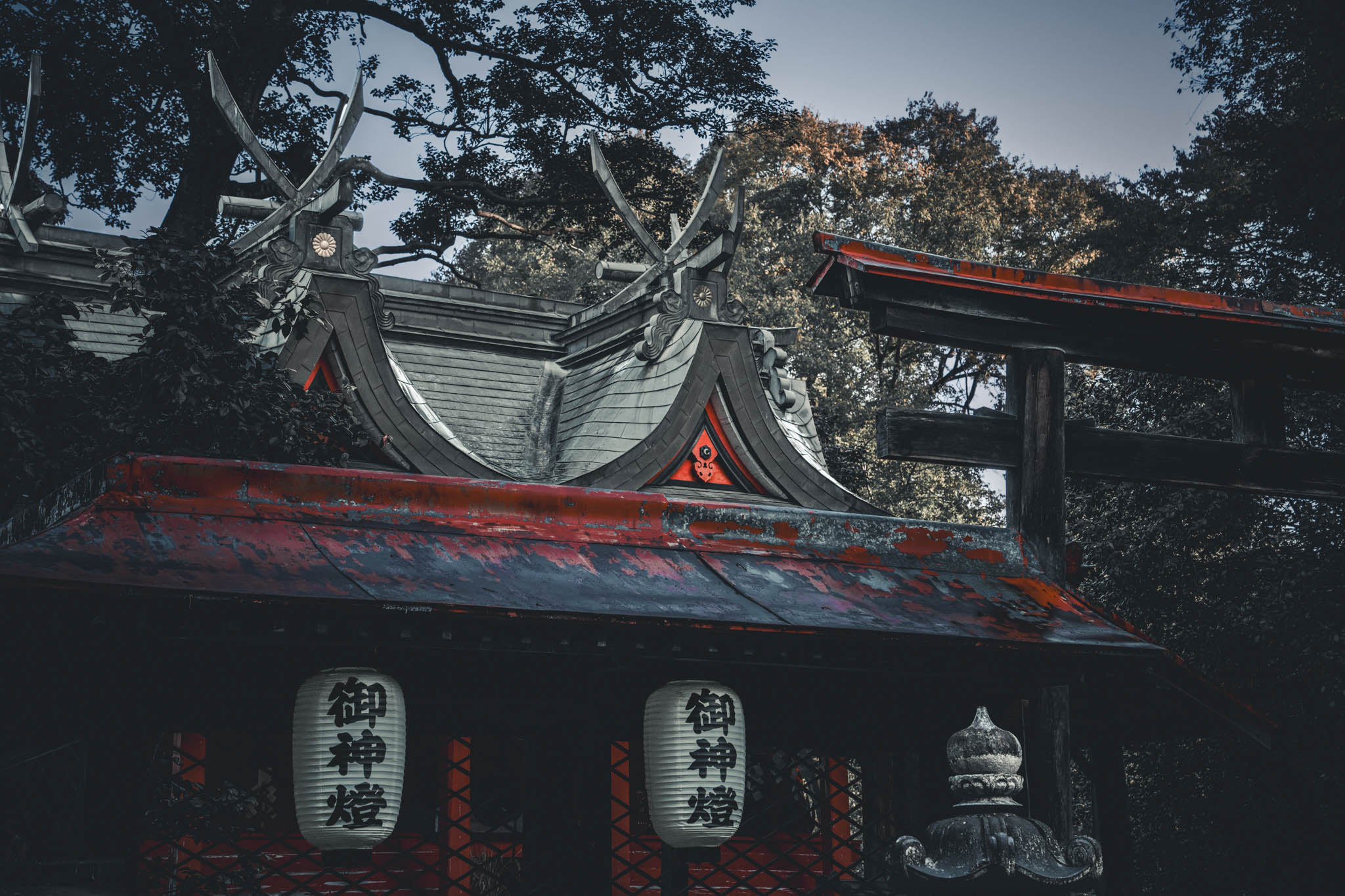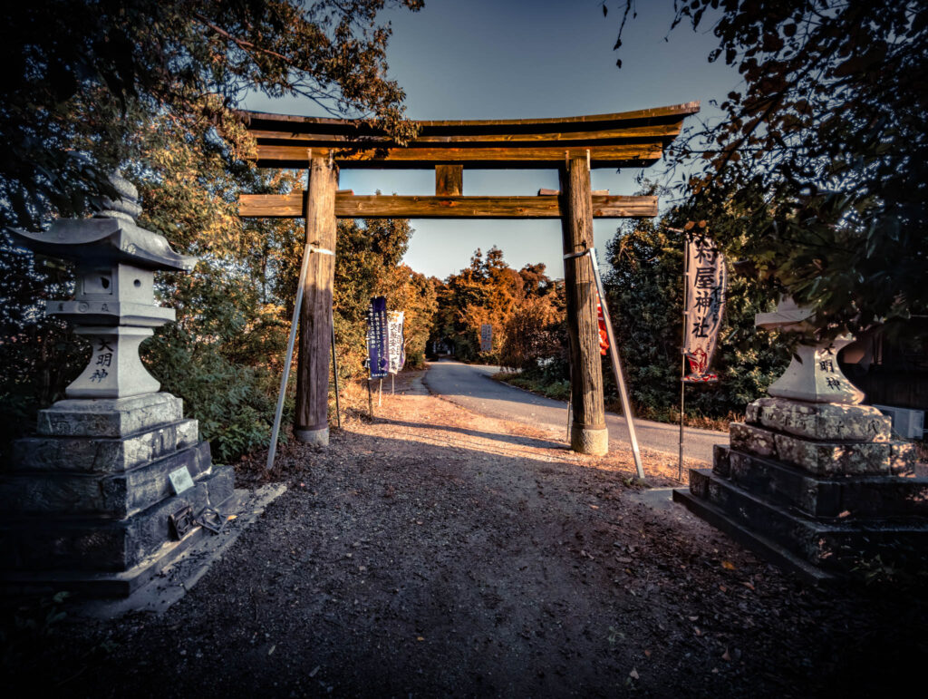 Oddly enough, even on the English version of Google Maps the shrine complex is labelled with kanji: 村屋坐彌冨都比賣神社. No hiragana anywhere, and only the last two characters (“jingu”, shrine) immediately recognizable to the poor student of the language such as myself. On the Web, that could be apparently translated in several different ways, for instance “Muraya-no-Isami-Yatomi-tsuhime Shrine” or “Murayazaya Tomihime Shrine” or ”Muraya-no-Izumi-Futsuhime-jinja” or “Muraya-ni-masu-Mifutohime-jinja”. The Japanese comments on the Google Map location suggest that many locals refer to the place simply as “Muraya Shrine” or even “Muraya-san”, among other familiarities.