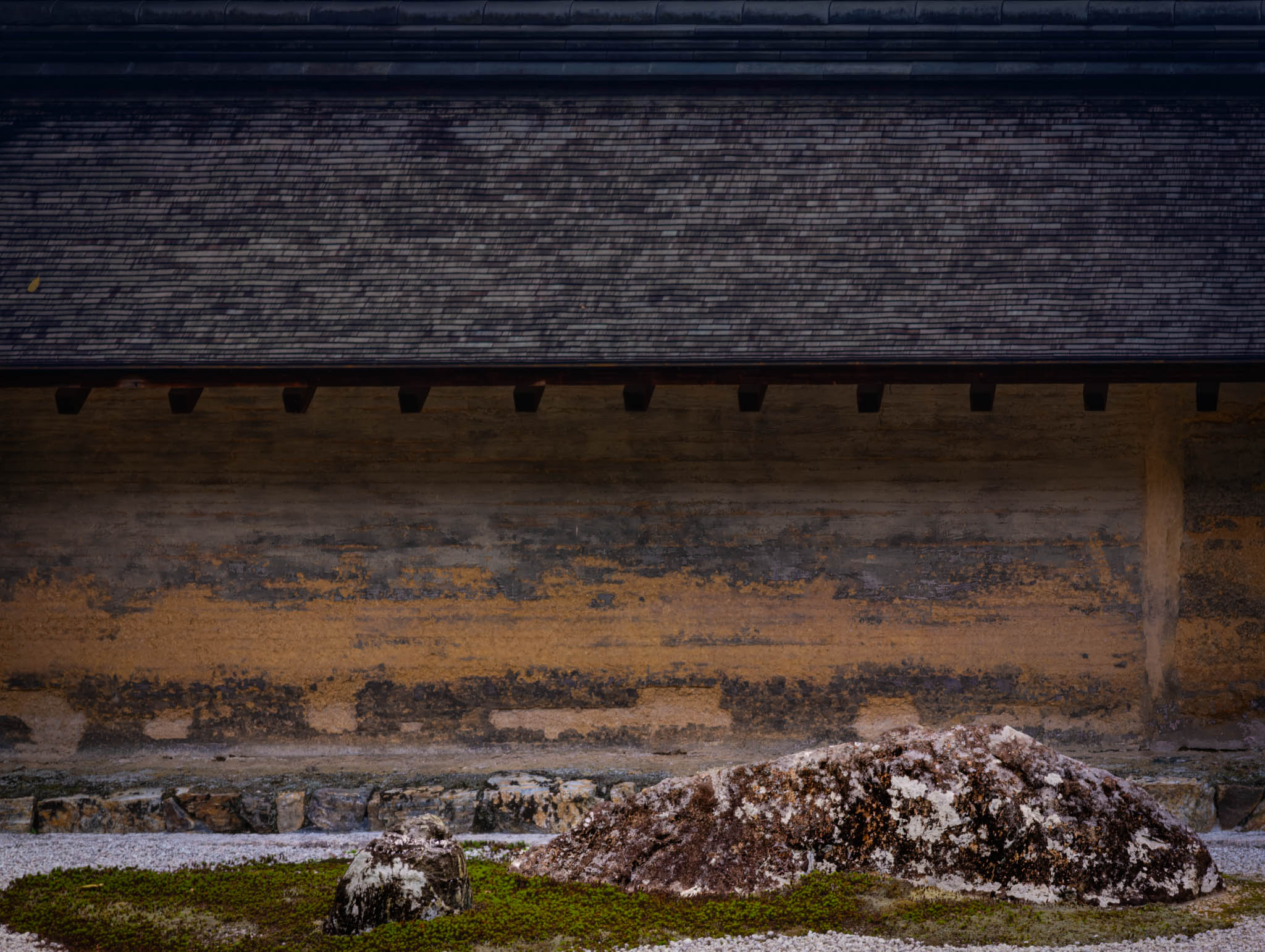 So what’s wrong with rocks and moss? The pointed, slightly-striated one at the east end, against the blank wall separating the garden from the forecourt of the Imperial Envoy’s Gate, is kind of striking. But I’m not going to count the rocks. I take it for granted that there are fifteen, even if I can’t see them all. Who cares? The wall that runs along the south and west sides of the gravel rectangle is even more interesting than the rocks. It’s described on the temple website as composed of earth mixed with rapeseed oil (basically, pressed from the seeds of a type of turnip): flaking, fissured and coarse, it indicates the rammed earth layering of its construction technique as well as its hidden vertical supports through black and orange and gray stains. And it has a bark-shingled roof of its own, topped by a formidable ceramic ridge. The wall appeals to the builder in me.