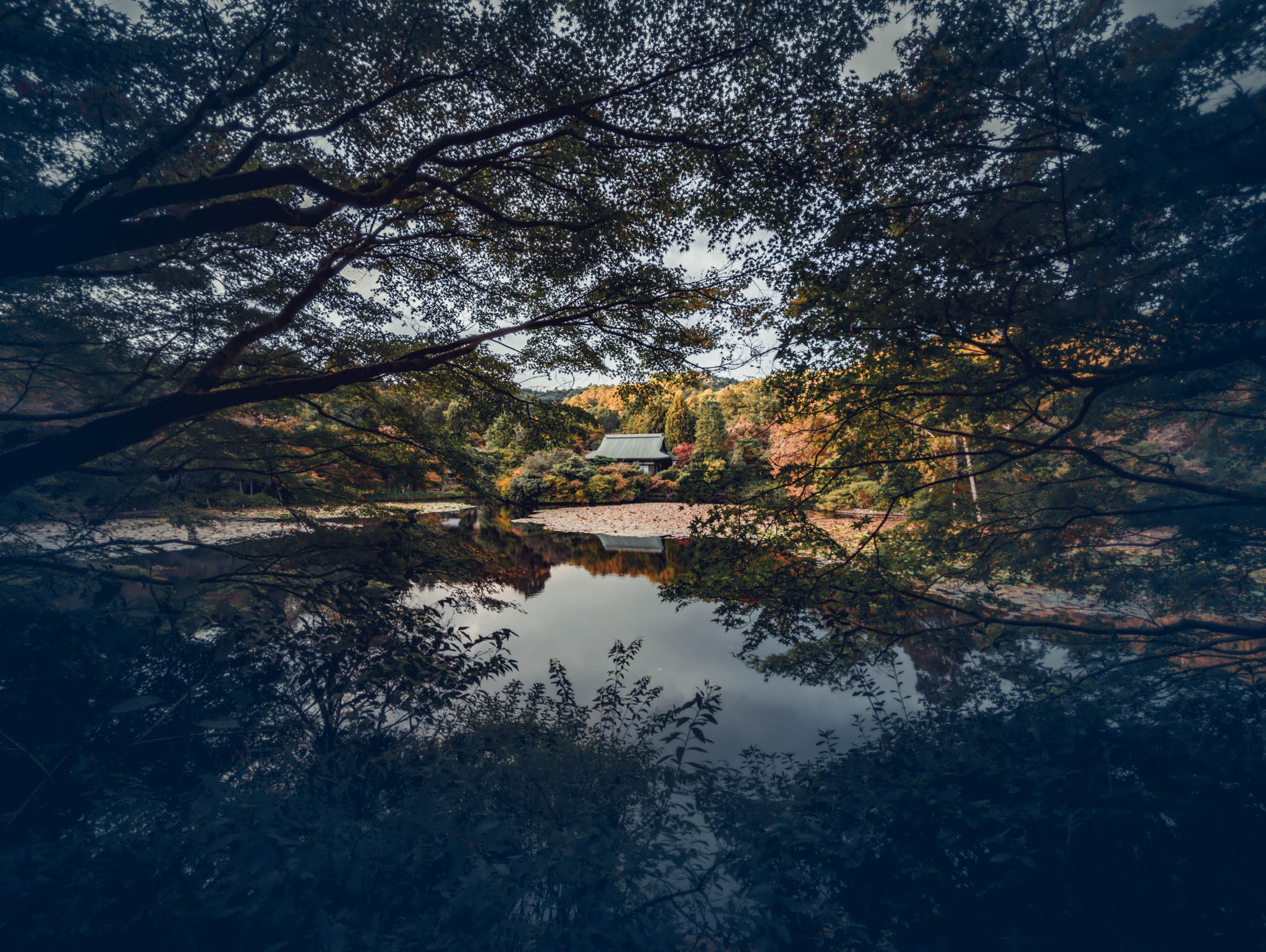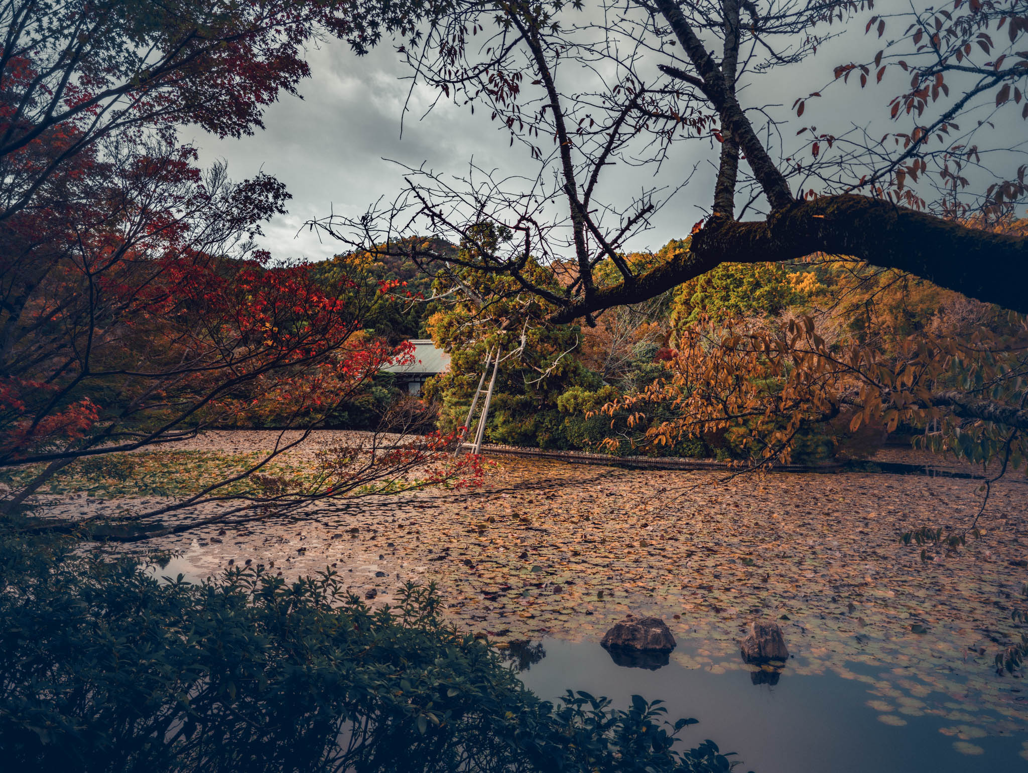 I capture a few pictures of the rocks and the wall, glimpse a tatami-floored chamber of the hojo (empty but walled with 襖 fusuma painted with marvelous cavorting dragons) before they slide the panels shut, and then (since there’s no time before closing to search out the famous coin-shaped water basin or the obscure north-side tea garden) rush out to dash around the mirror pond, which reflects sunset autumn tints in the best Japanese taste. In fact, our taxi is the last waiting in the otherwise empty parking lot.