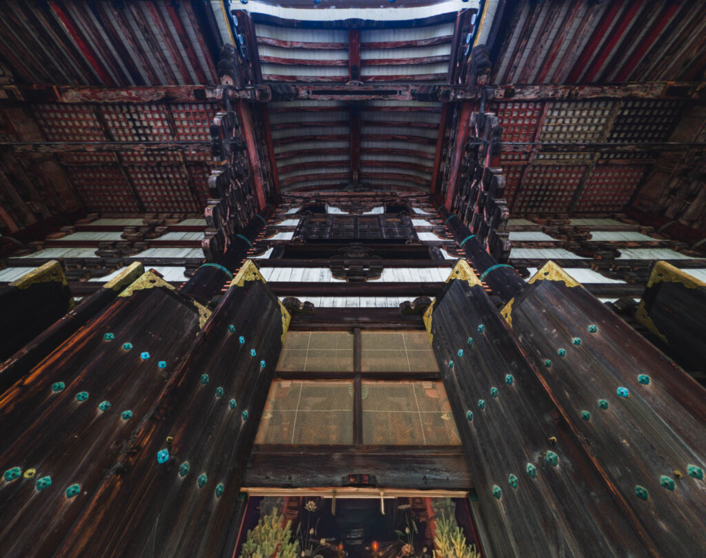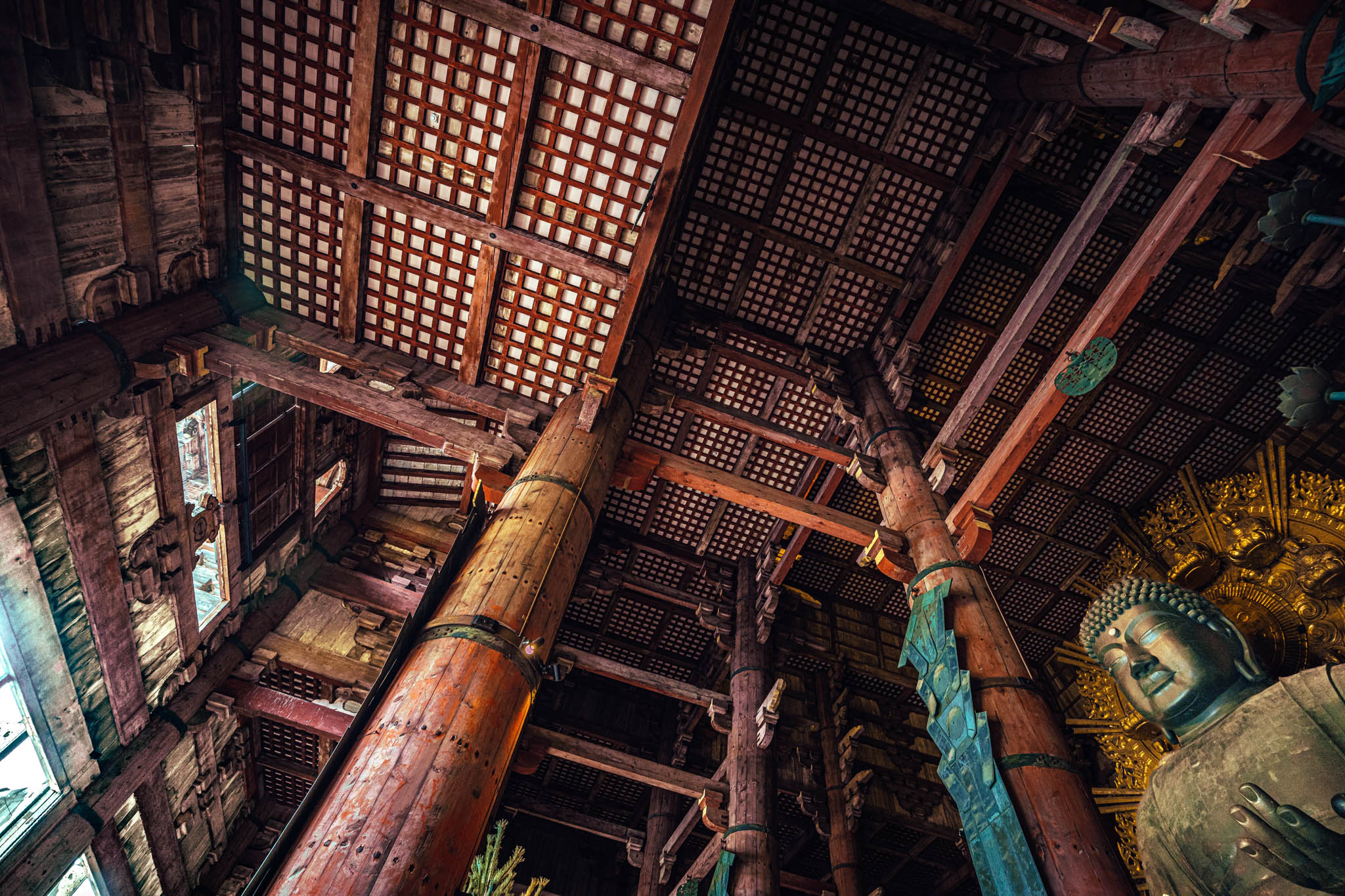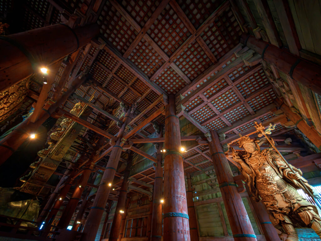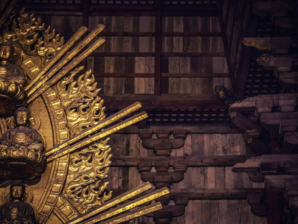 But much as with moksha and relief from the grinding of the Great Wheel, I do not understand how the odd scale-lessness in the hall is achieved. Is it the dimness in combination with the repetitive, seemingly-endless framework of column and beam, a permanent scaffolding alternately obscuring and revealing the Mahayana divinities? A suggestion of infinity? Or some other phenomenon entirely?