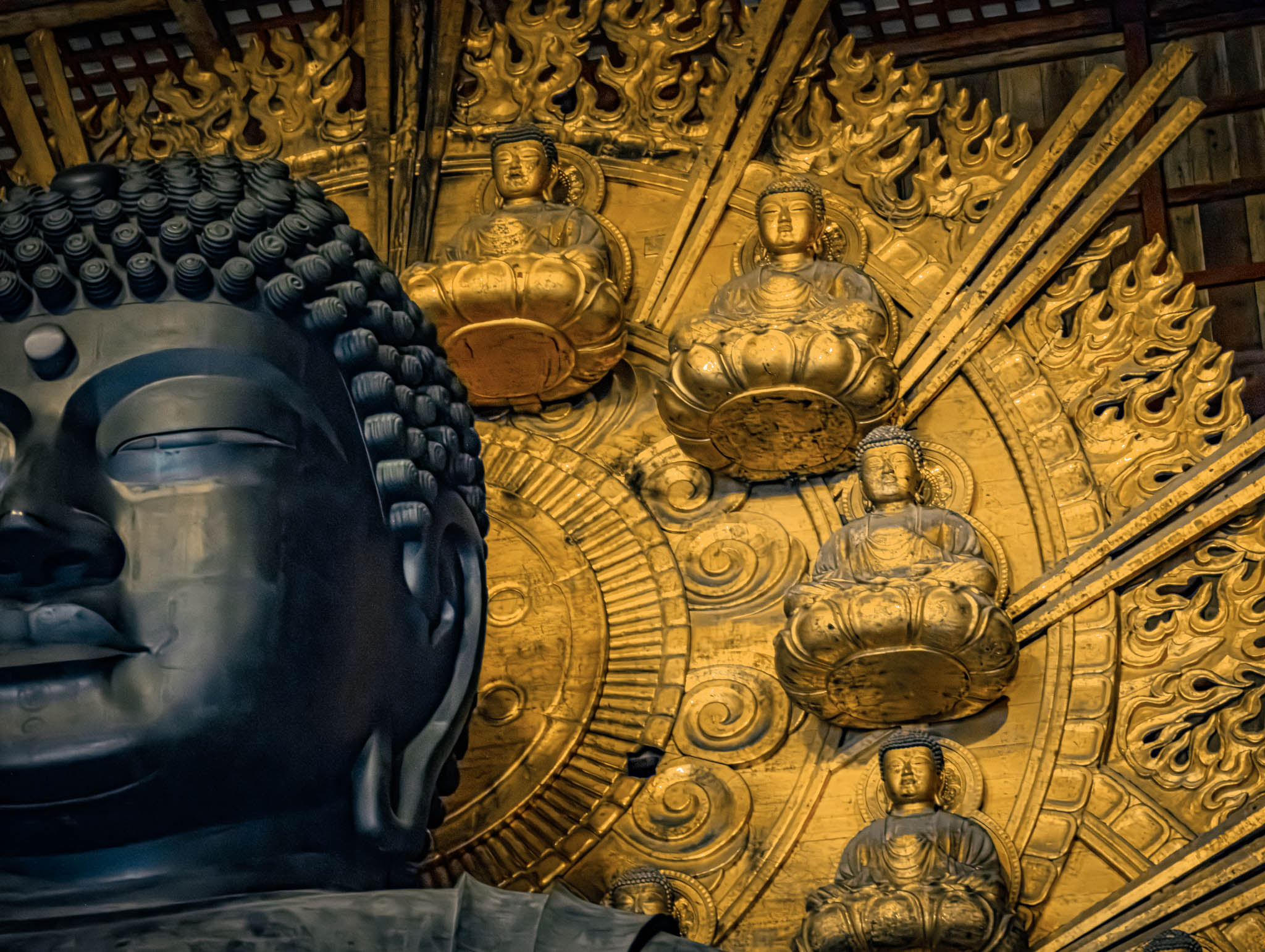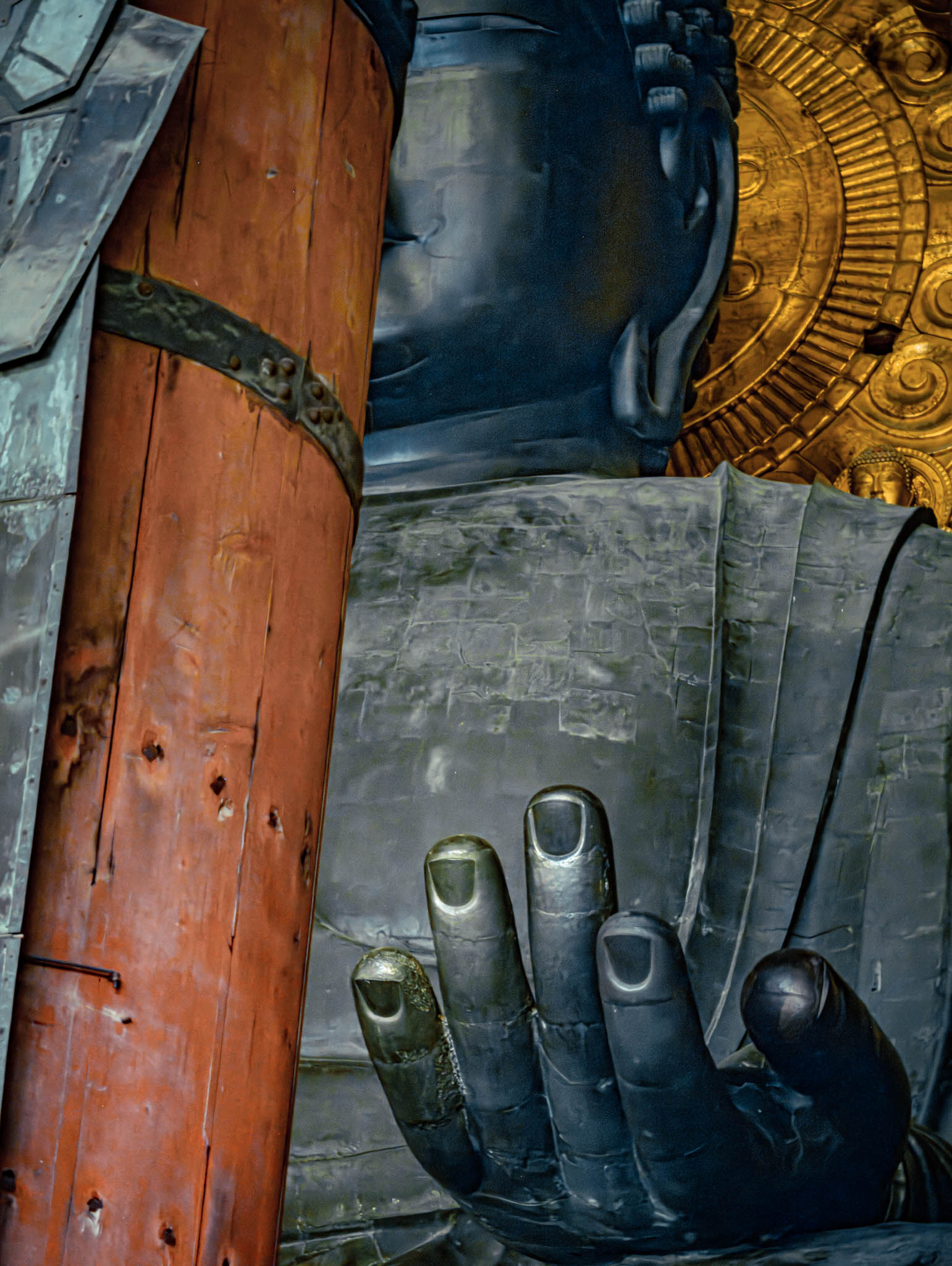 The face of the much-restored great Buddha (which always seems slightly out-of-focus) is twice the height of a tall man, and the many lesser Enlightened Ones seated in lotus position within the golden emanations of His nimbus are actually life-sized.